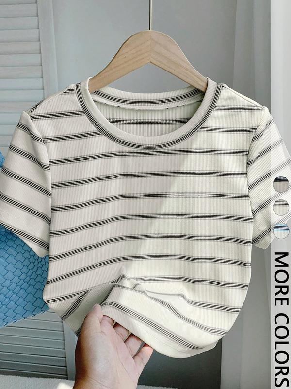 1 Piece Striped Slim Cropped Top | Sweet Cool  Aesthetic | Crew Neck Short Sleeve + Stretchy Ribbed Design | Perfect for Girls' Shopping Spree / Café Photo Ops