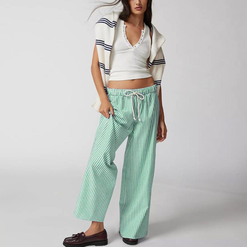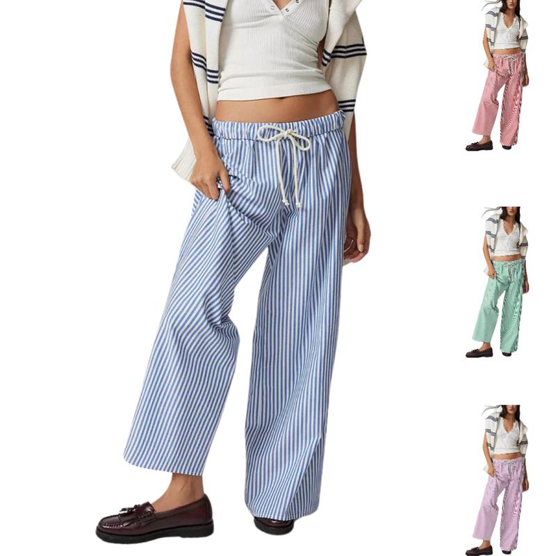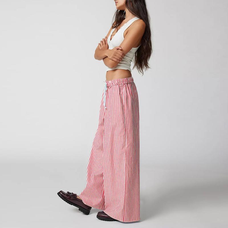 Tanming Women Casual Drawstring Striped Pants Wide Leg Pants Elastic Waist Trousers with Pockets