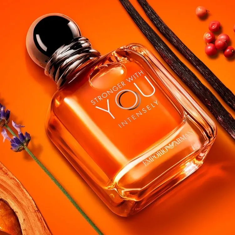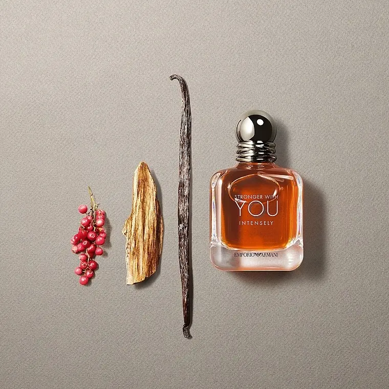Stronger With You Intensely is an intense and addictive fougere amber-woody scent. The fragrance opens with a spicy pink pepper essence that combines with the iconic Stronger With You Intensely chestnut accord, bringing warmth and originality to the fragrance. The heart, a combination of lavender and sage, conveys a confident elegance and the easy insouciance of youth. The base notes, a blend of amber wood and vanilla essence, enhance the vibrance and intensity of the sillage.