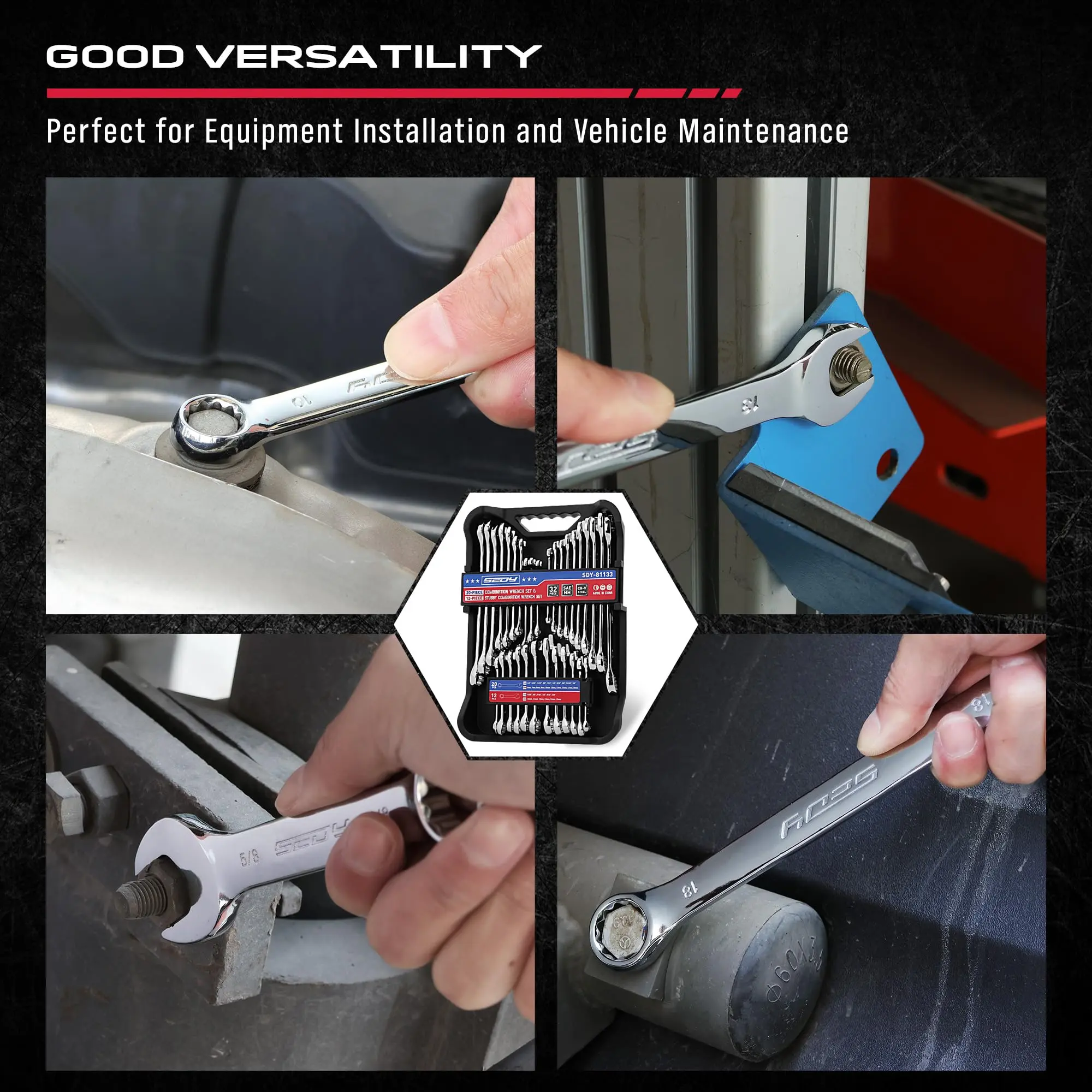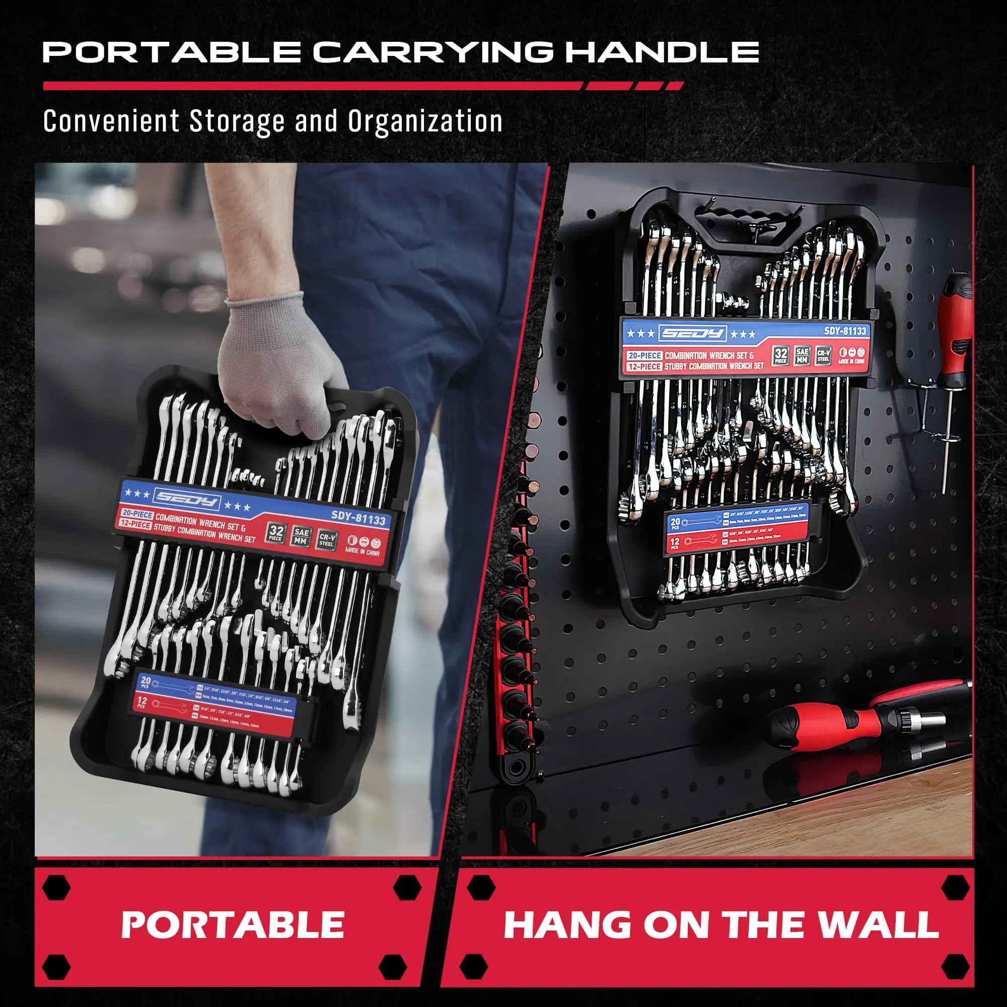 VERSATILE DESIGN - Our 32-Piece SAE & Metric Combination Set includes 20 standard and 12 stubby wrenches, ranging from 1/4" to 3/4" and 6mm to 18mm, equipped with an organizer box for enhanced portability and quick access