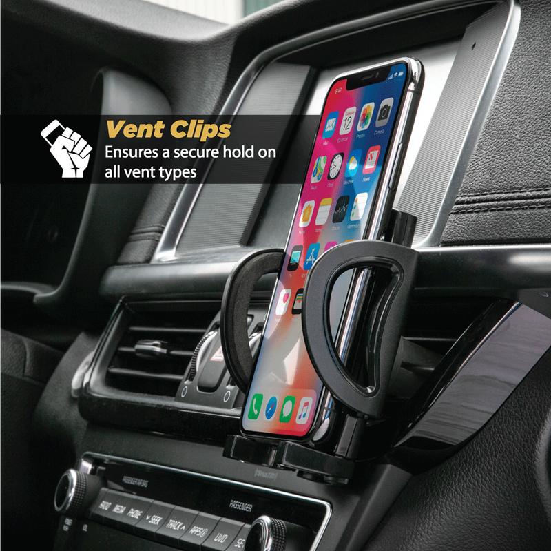 • 4-in-1 universal mount kit for vehicle window, dash, vent, cup holder, or flat surfaces at home or office.