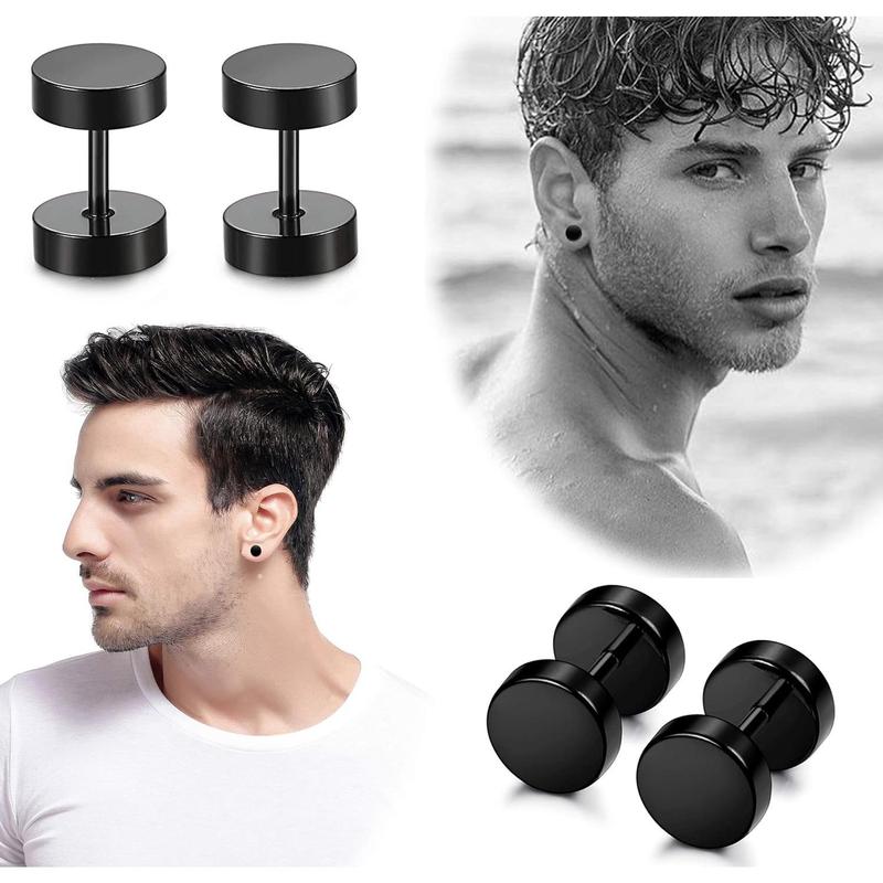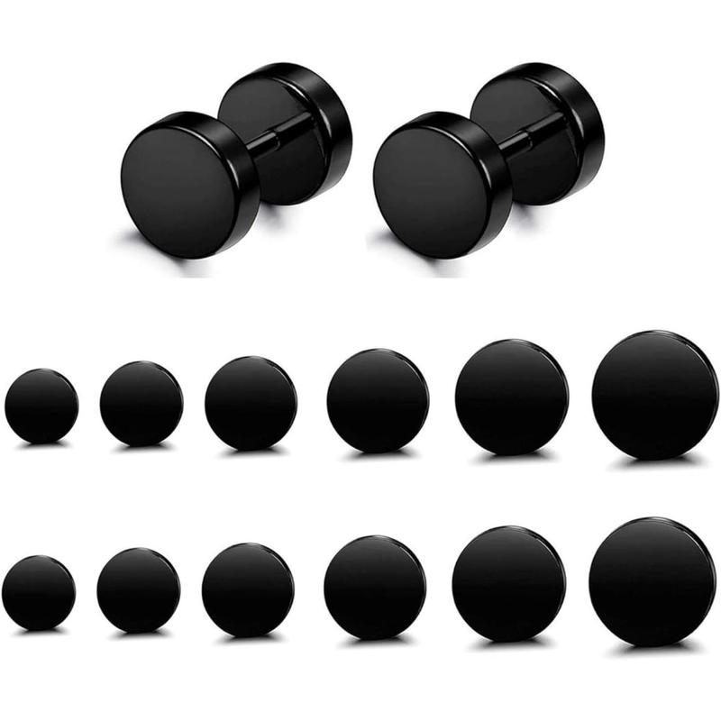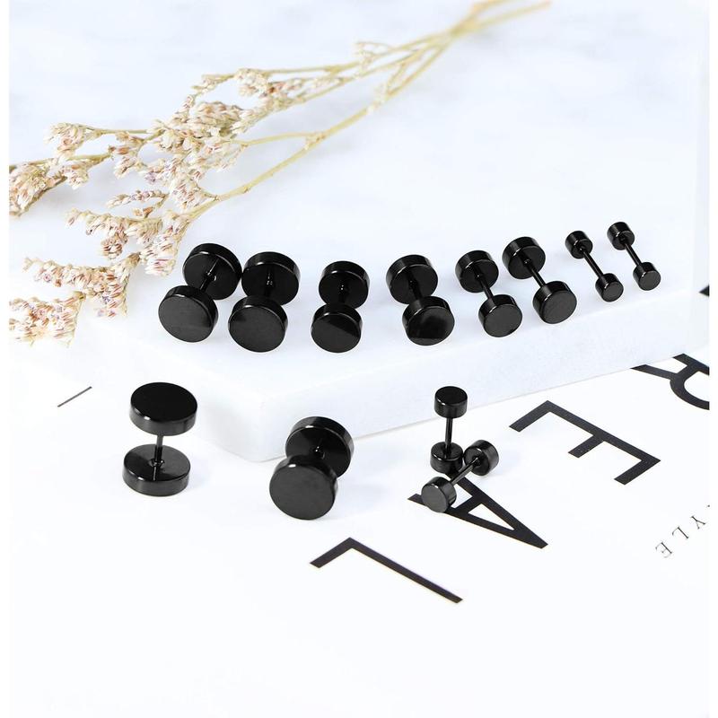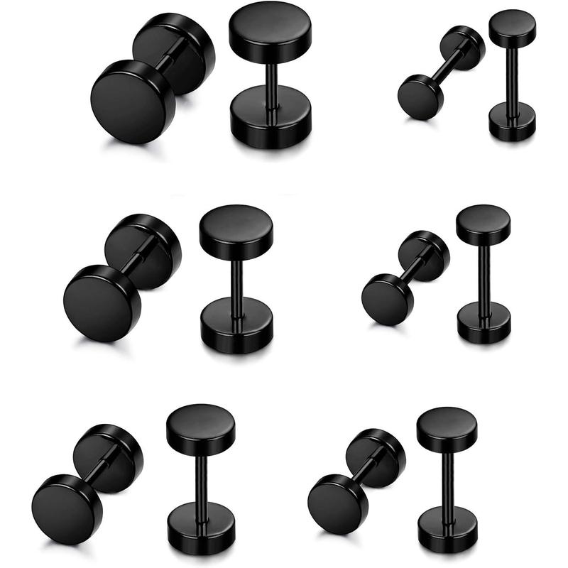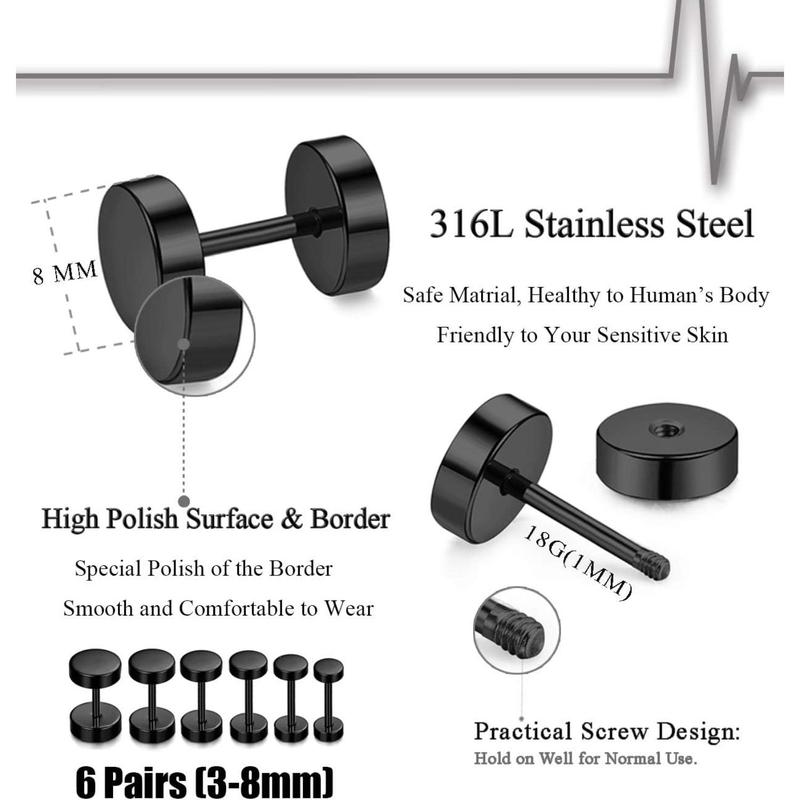Jstyle 6 Pairs Stainless Steel Black Stud Earrings for Men Women Faux Gauges Ear Tunnel Fake Gauge Earrings 3-8mm Daily