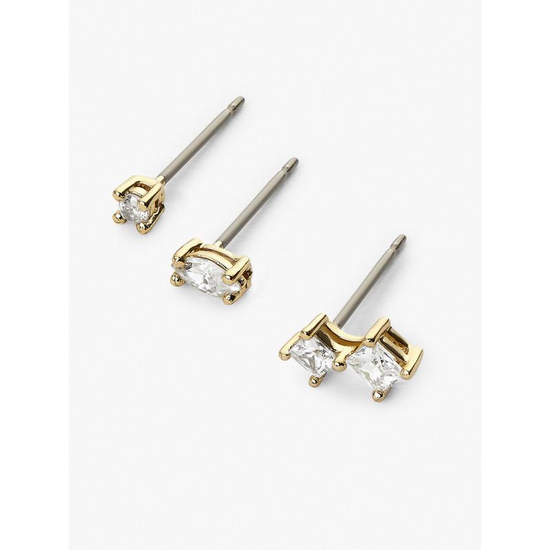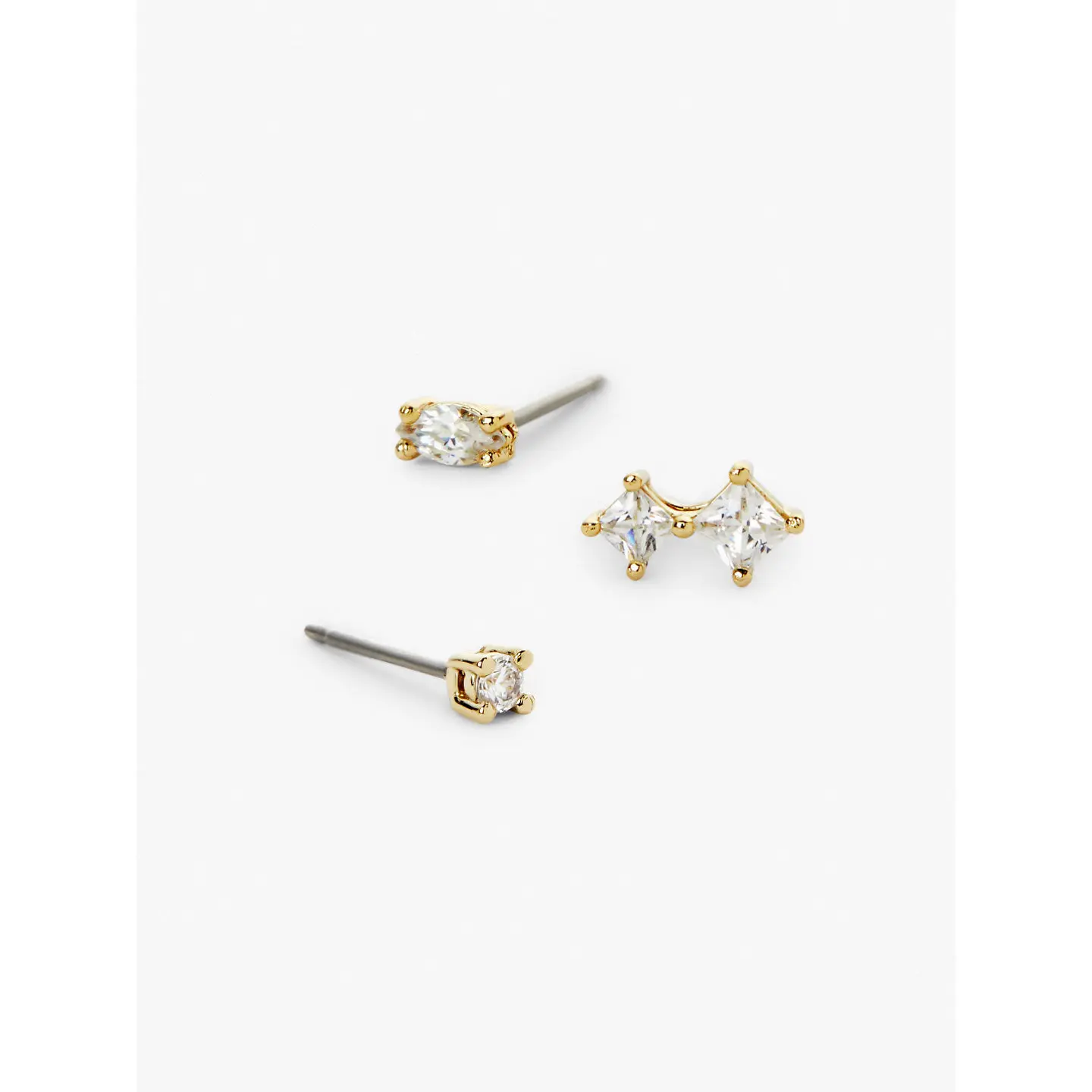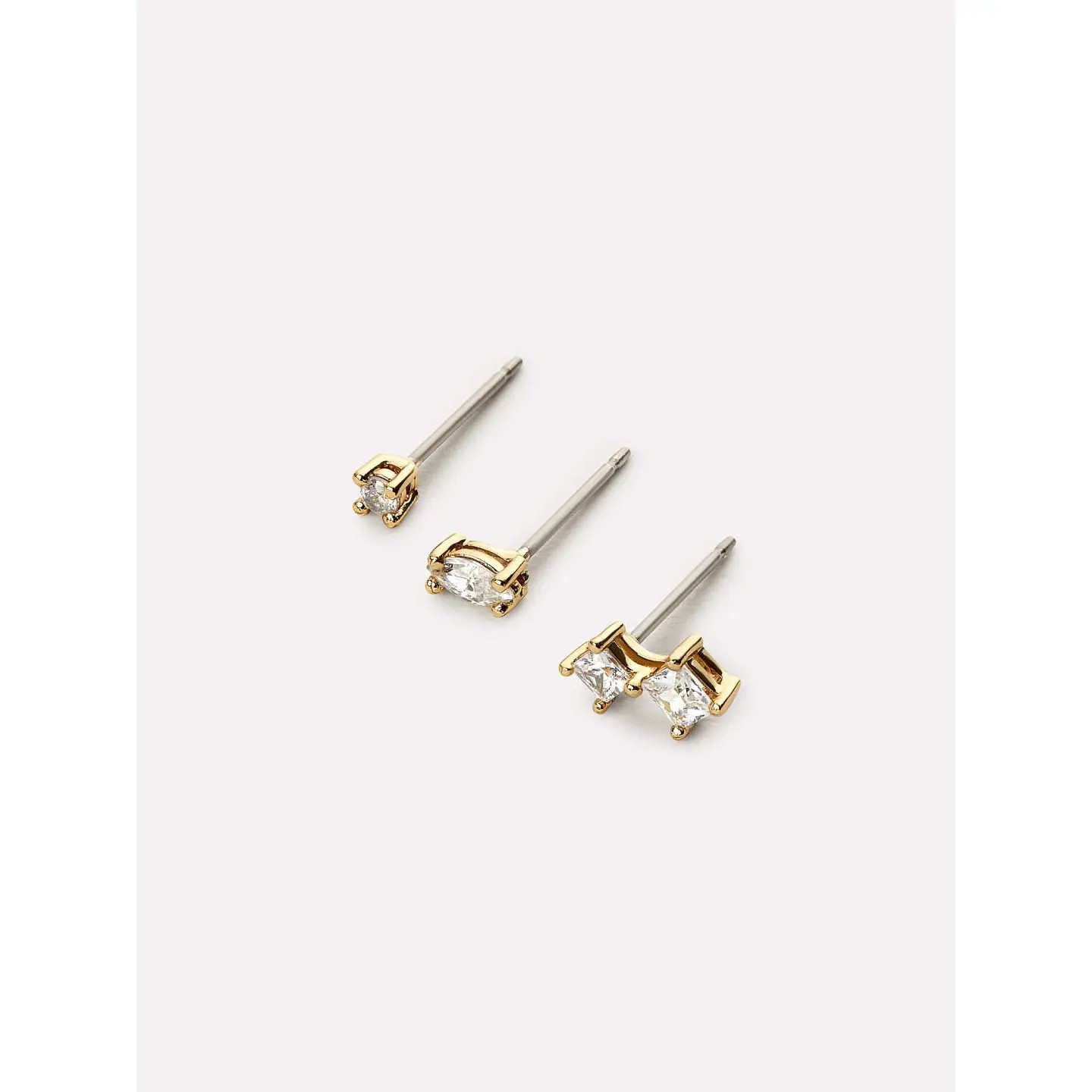 This stud earrings set with white cubic zirconia set in prongs is sure to add a bit of sparkle to your earring game. Dipped in 14K gold, these earrings are delightfully comfortable and so lightweight, you'll forget you have them on. Mix or match these sparkling studs earrings set for an original look or create the ultimate ear stack. This set is also available with pink-red gemstones, and with blue-green gemstones.