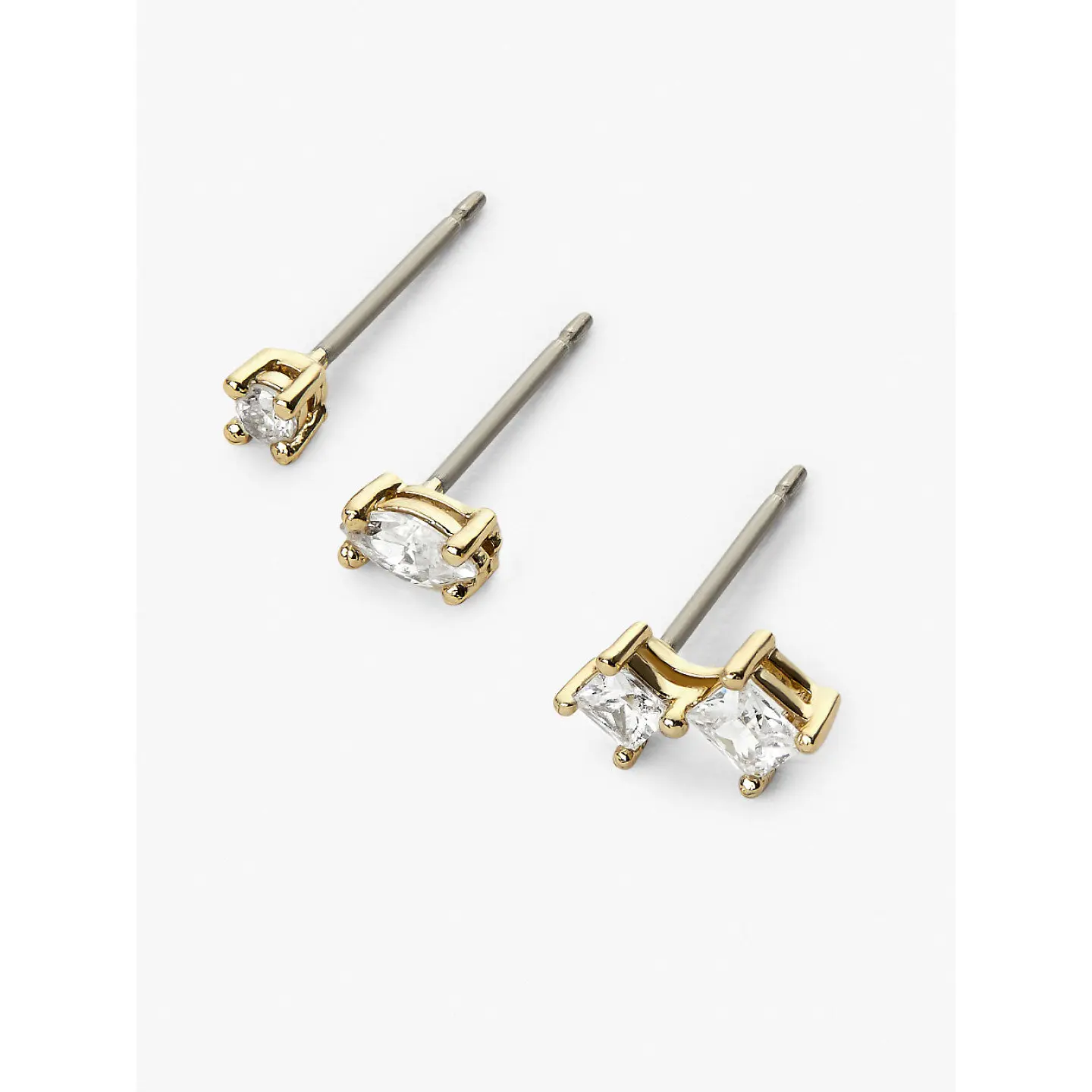 • Versatile studs dipped in 14K gold • Three earrings with prongs-set white cubic zirconia • Chic, lightweight