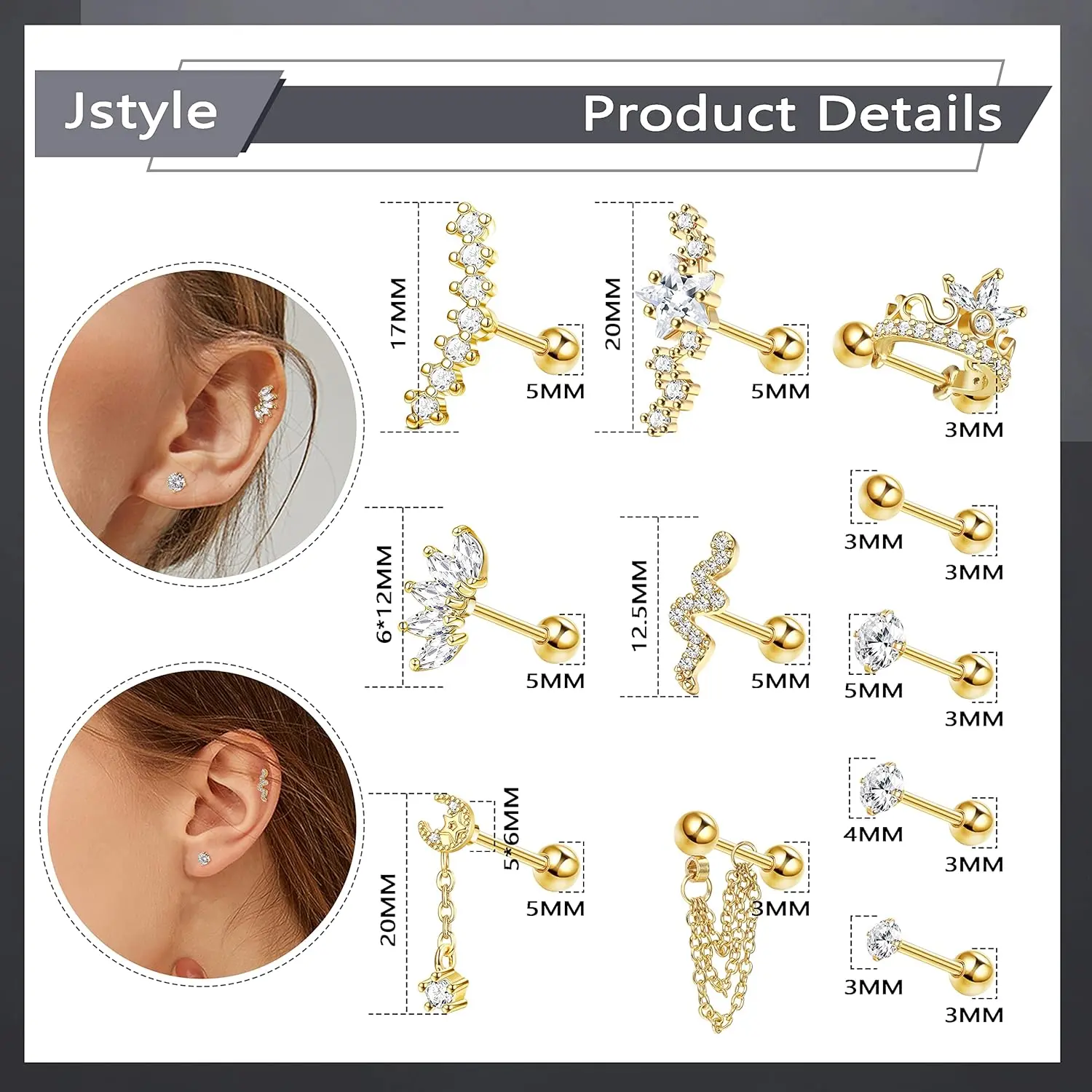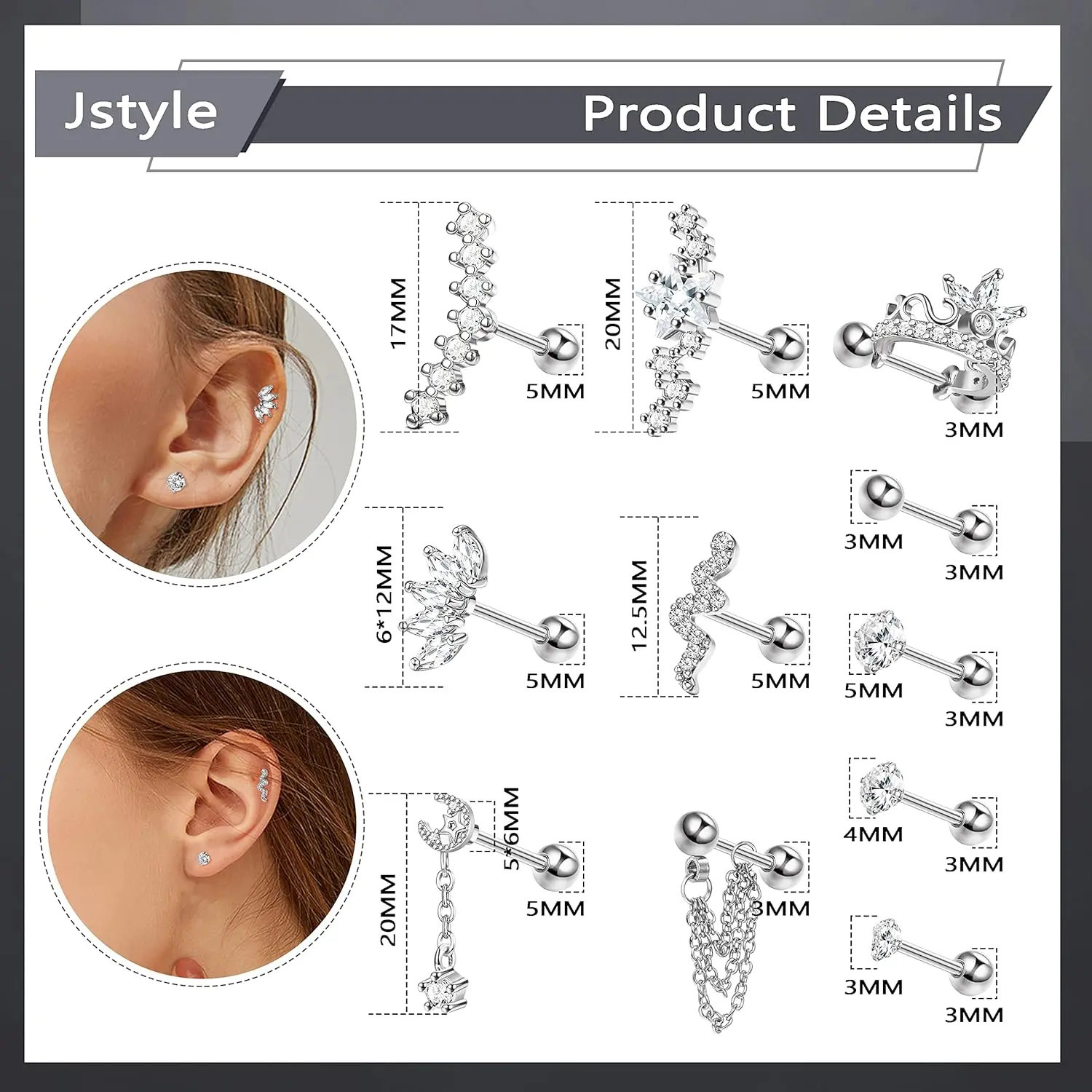 Jstyle 14Pcs Stainless Steel Stud Earrings Set for Women Star Moon Snake 16G Cartilage Earrings Set Hypollergenic Screw Back Earrings Helix Piercing JewelryJstyle 14Pcs Stainless Steel Stud Earrings Set for Women Star Moon Snake 16G Cartilage Earrings Set Hypollergenic Screw Back Earrings Helix Piercing Jewelry