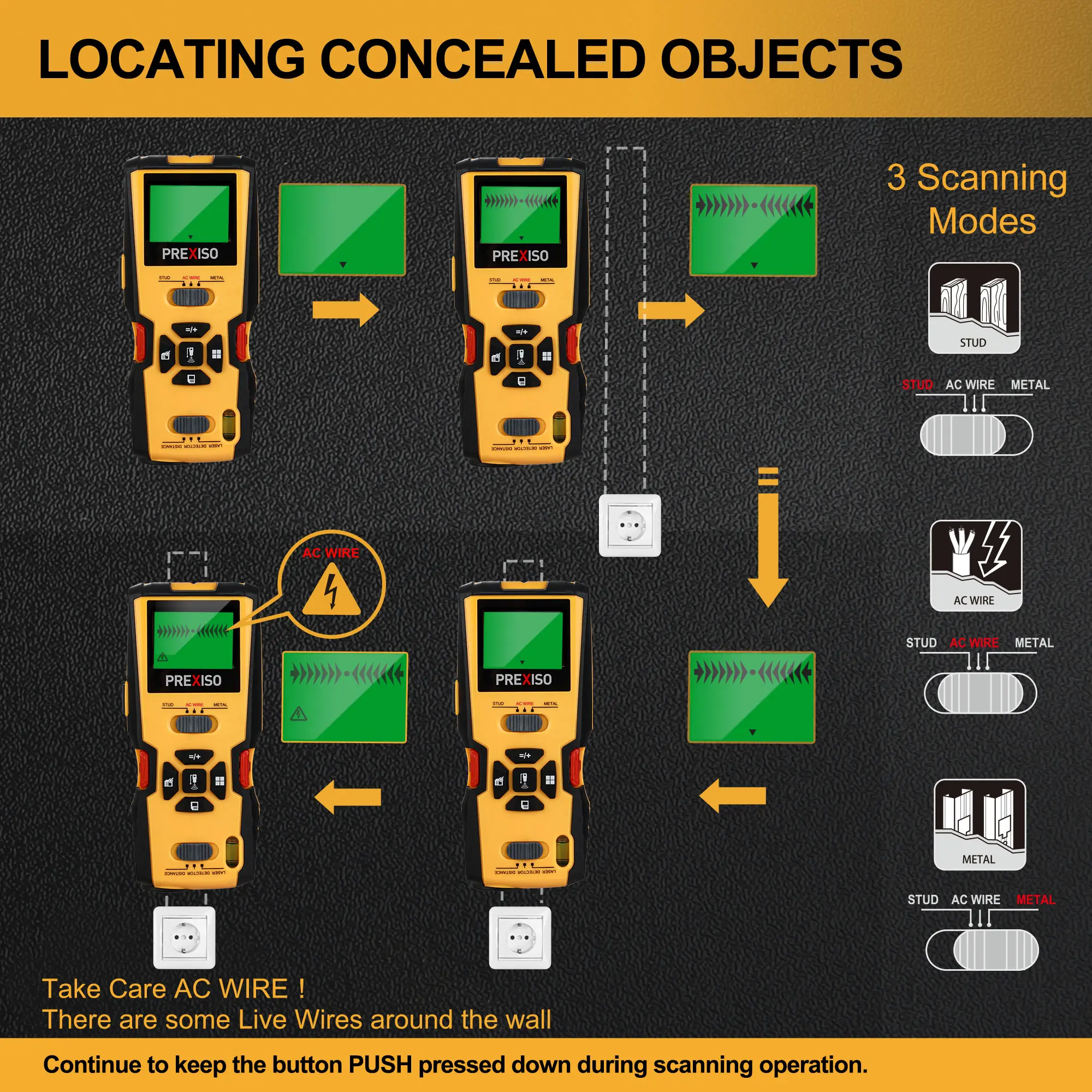 ·𝟑 𝐒𝐜𝐚𝐧𝐧𝐞𝐫 𝐅𝐞𝐚𝐭𝐮𝐫𝐞𝐬 𝐬𝐭𝐮𝐝 𝐦𝐨𝐝𝐞𝐬: PREXISO stud locator with multi-functions could quickly and easily locate wood studs metal pipes and live AC wires behind walls, floors, and ceilings; Scanner features stud modes with 3 depth types, detecting up to 1 inch deep in drywall; Metal mode could detect various metal materials deep up to 1-1/2 inches; and AC mode detects live AC wires up to 1-3/8 inches