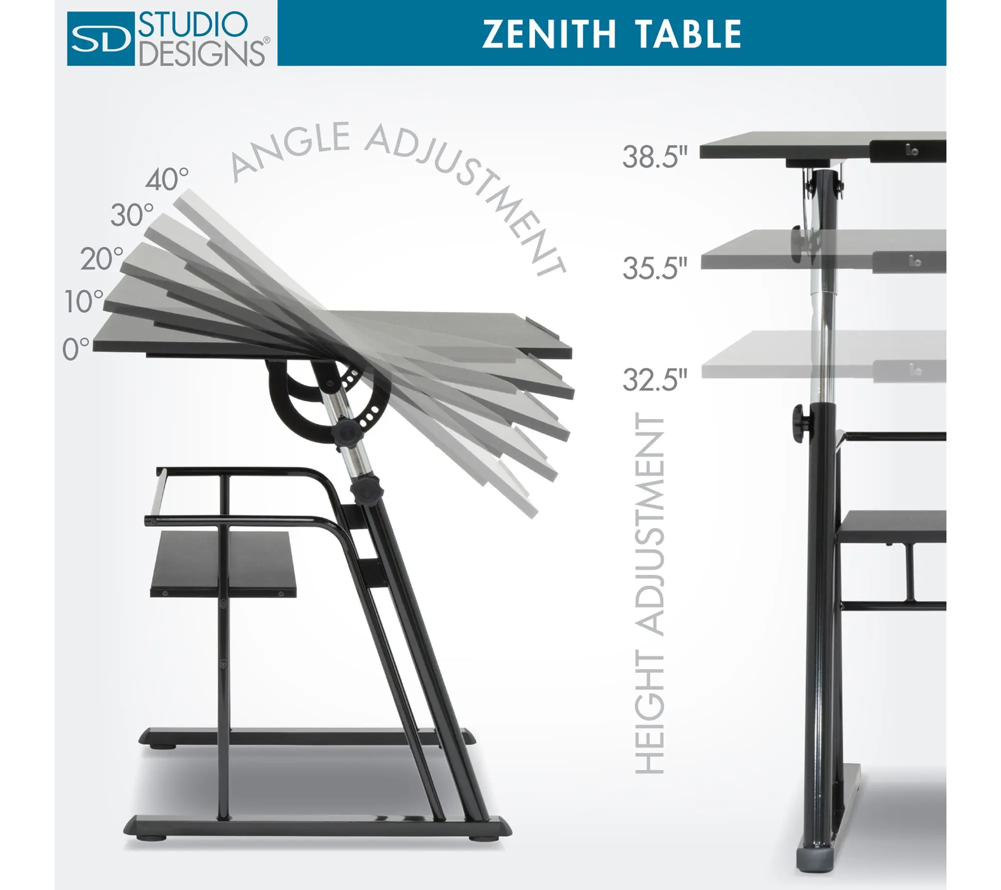 ·Features five adjustable angles (flat to 40 degrees); height adjusts from 32.5" to 38.5"