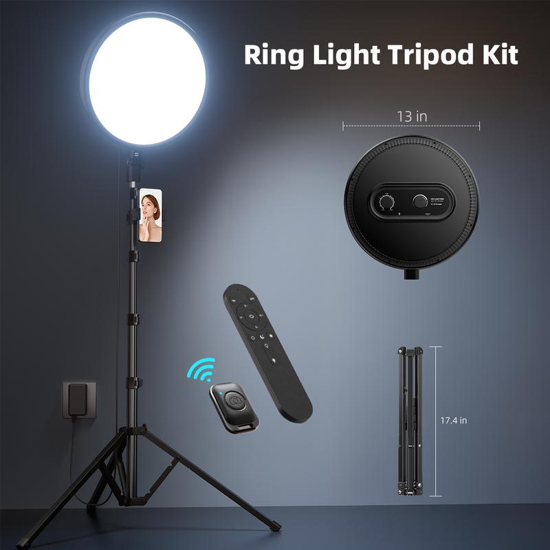 Ever struggled with poor lighting during your makeup tutorials or live streams? This 13" full-screen ring light is your new best friend, delivering bright, shadow-free illumination that makes your content pop. With three color temperatures from warm to daylight and 10 brightness levels, you get total control over your lighting vibe. The 79" adjustable aluminum stand lets you find the perfect height, while the 360ยฐ rotatable phone holder fits most smartphones, making filming a breeze. Plus, two handy remotes let you tweak settings or snap selfies without moving a muscle. Whether you're shooting 4K videos, hosting podcasts, or snapping product photos, this ring light kit has you covered. It includes everything you need: the ring light, tripod stand, phone holder, two remotes, and power adapter. Ready to light up your creativity? Grab this studio-level lighting setup and shine bright in every frame!
