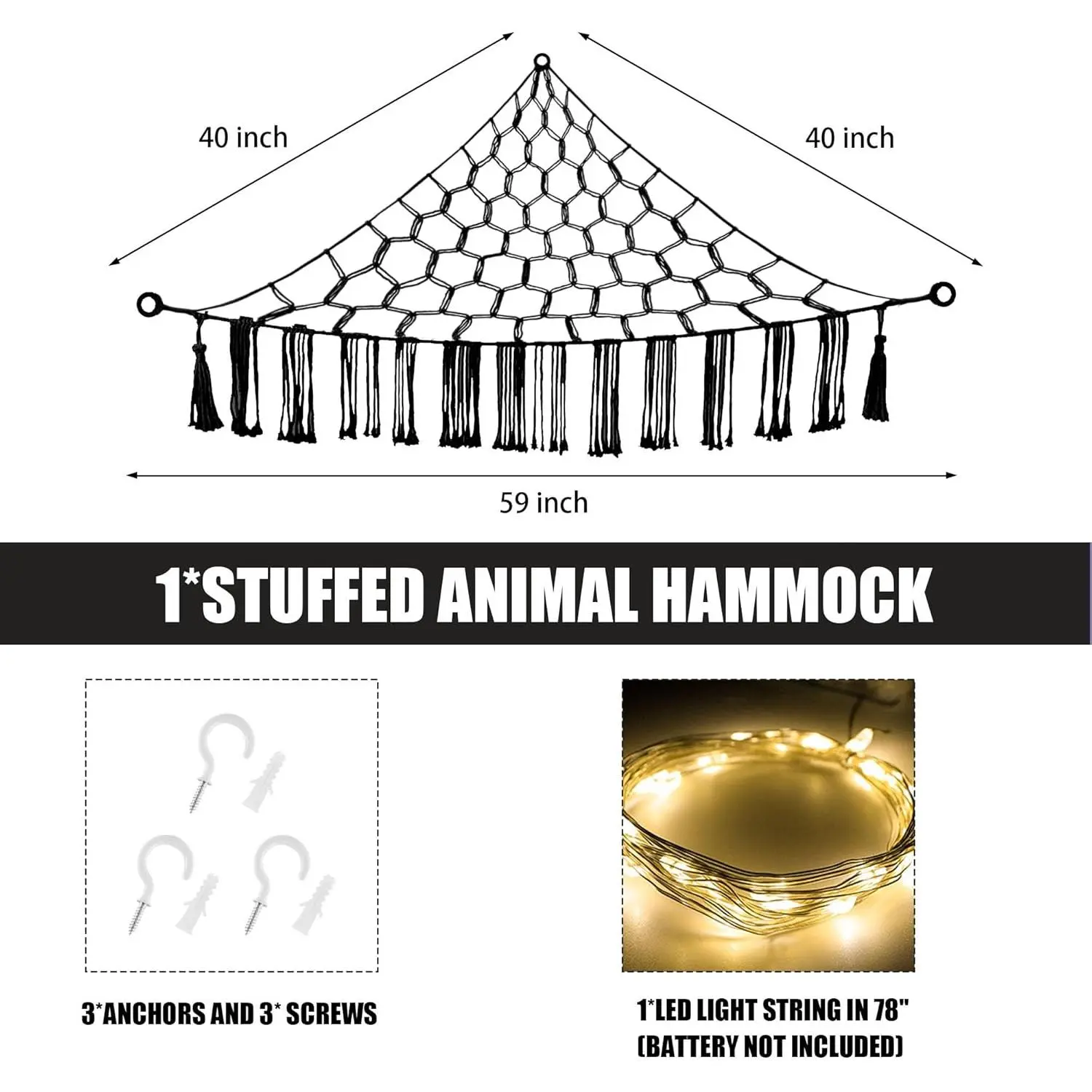 【Package Included】1*Stuffed Hammock, 1*Led Light String in 78"( not included), 3*Anchors and 3* Screws. No additional accessories are required. Find the ideal location and install the stuffed holder in the corner.