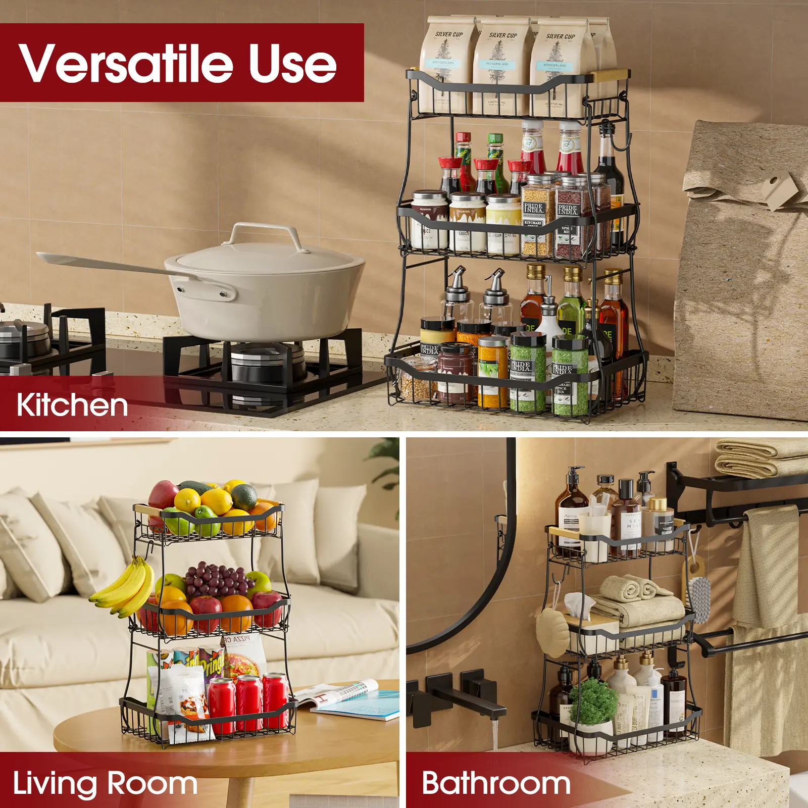 The 2/3 Tier Square Fruit Basket Stand is a durable metal countertop organizer. It features a space-saving stackable design, perfect for storing fruits, snacks, bread, and produce. This stylish kitchen counter organizer is ideal for home use. The large capacity storage ensures you have ample space for various items.
