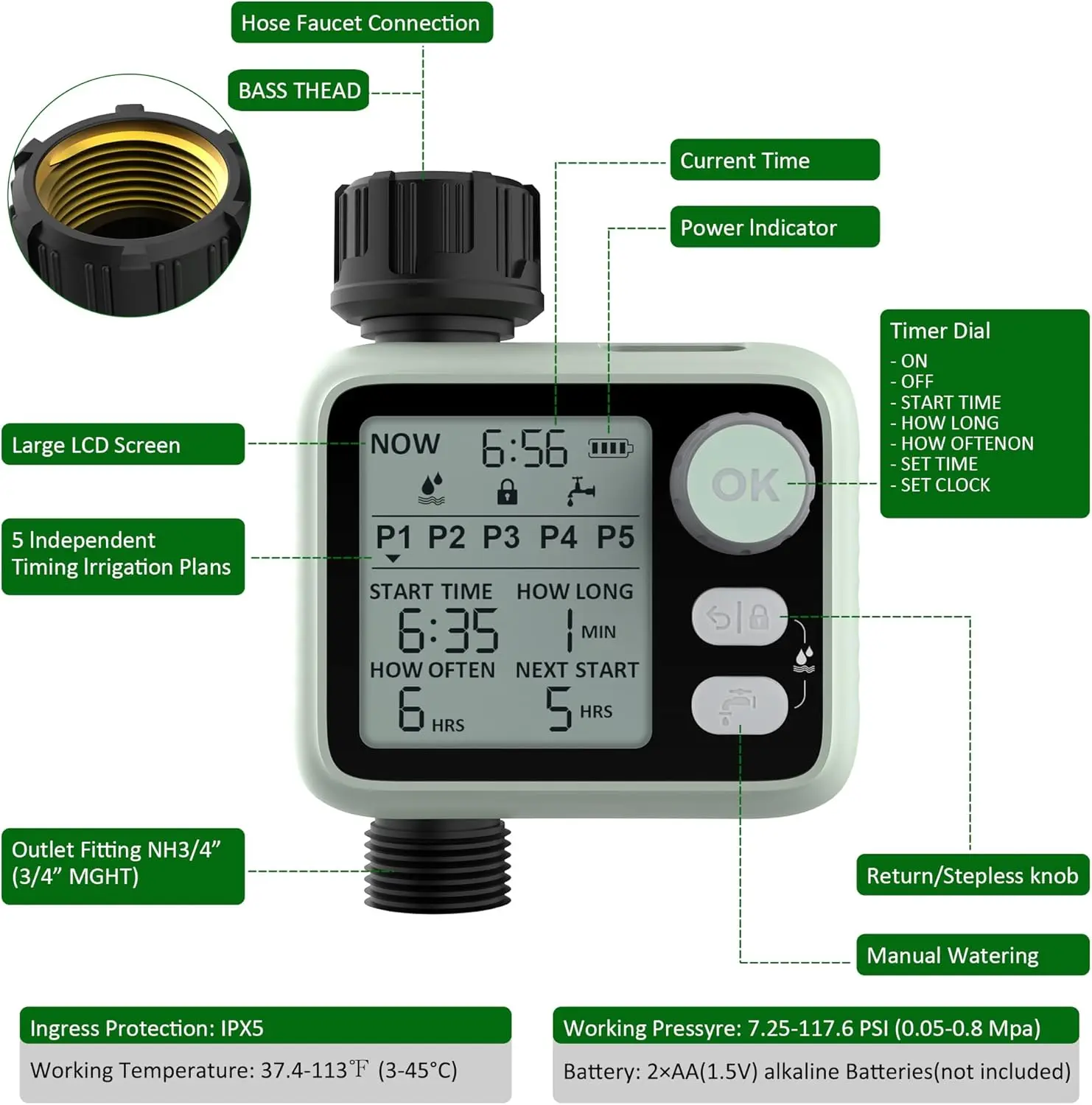 ·LARGE CLEAR LCD DISPLAY AND ROTARY DIAL MECHANISM - This water timer has a large LCD screen, a rotating dial and two buttons that make programming a breeze. The easy-to-use function dial makes it easy and straightforward to program your watering schedule, while the large LCD screen display makes everything clear at a glance.