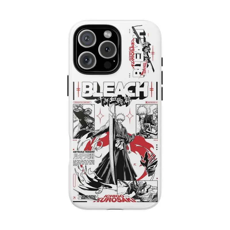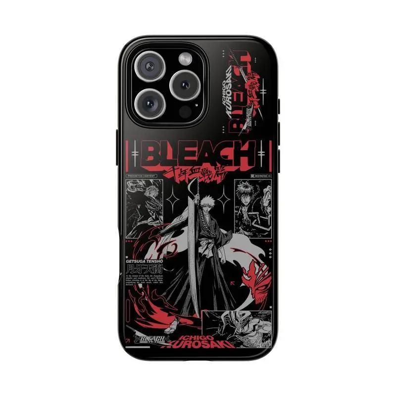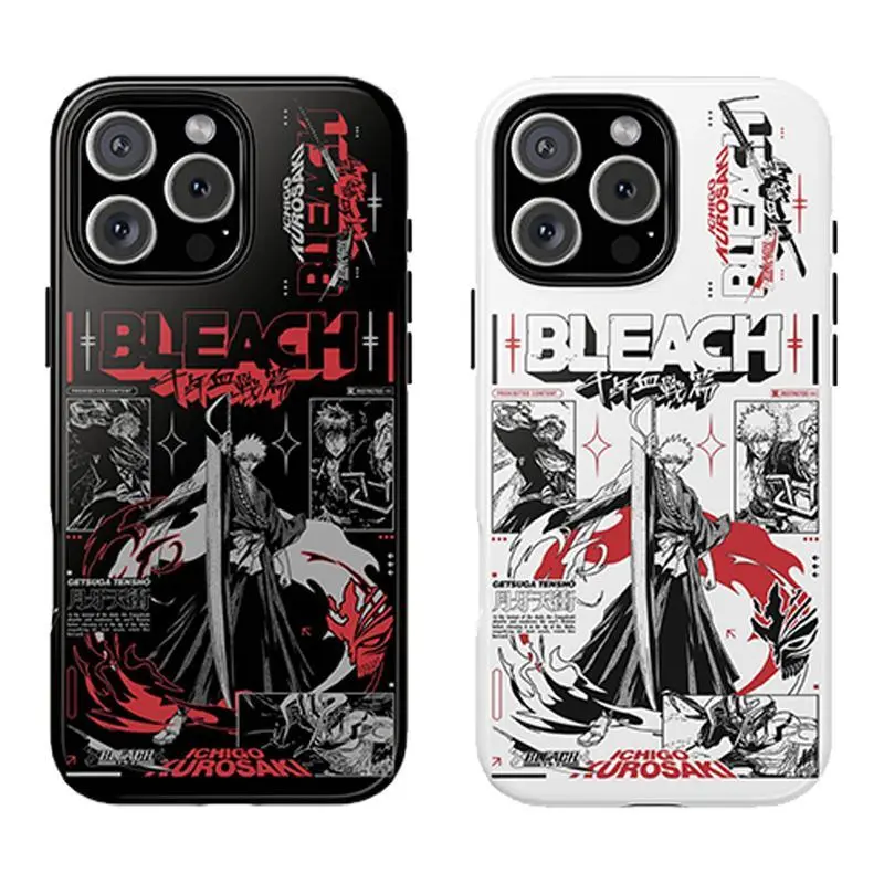 Stylish Bleach anime Ichigo Kurosaki phone case, black and white color scheme, compatible with iPhone 17/16/15/14/13/12/11 Pro Max/Plus and Samsung Galaxy S23FE/22/23/24/25. A perfect gift for family and friends.