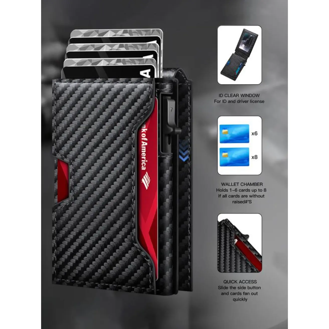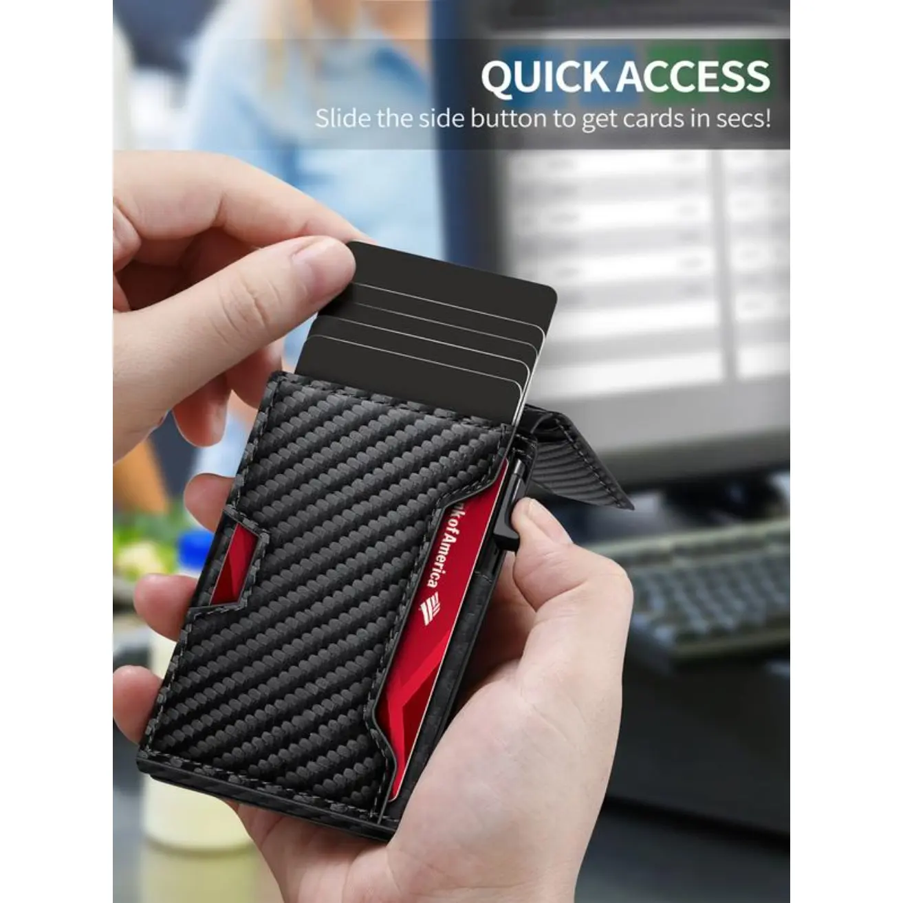 With a simple slide of the button, your cards smoothly eject in a staggered layout for quick and effortless access. No more digging through bulky wallets.
