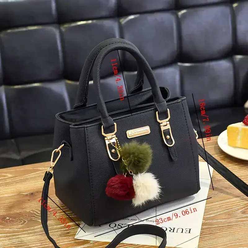 [Stylish Handbag] Versatile Stylish Handbag | Lychee Pattern with Adjustable Strap, Pom Pom Ball Charms, Metallic Hardware - Crossbody Purse for Women in Black, Army Green, Khaki, Light Grey, Dark Grey, Red