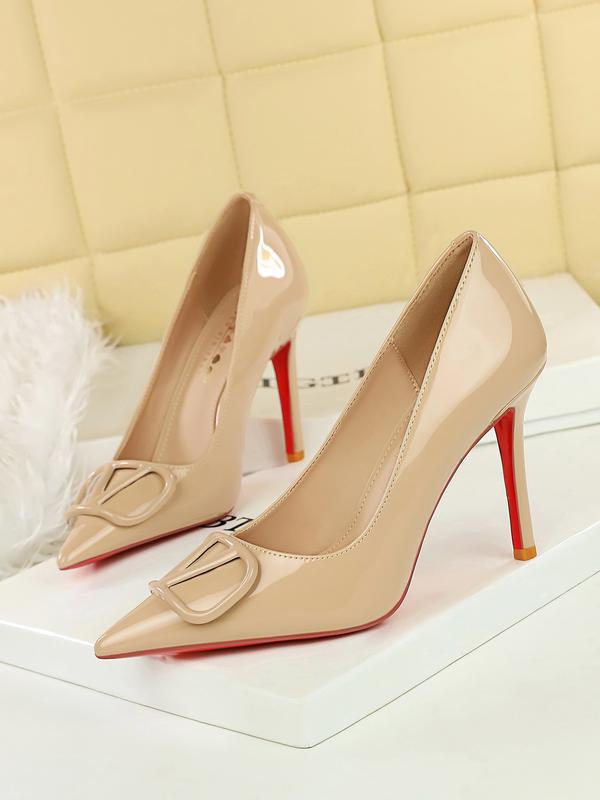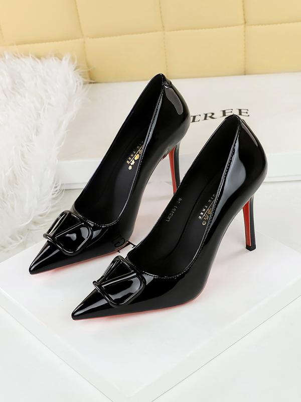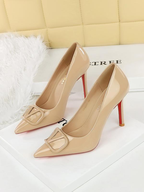 8351-K117 Stylish High Heels for Women, Elegant Pointed Toe in Glossy Patent Leather, V Buckle Detail, Perfect for Parties8351-K117 Stylish High Heels for Women, Elegant Pointed Toe in Glossy Patent Leather, V Buckle Detail, Perfect for Parties