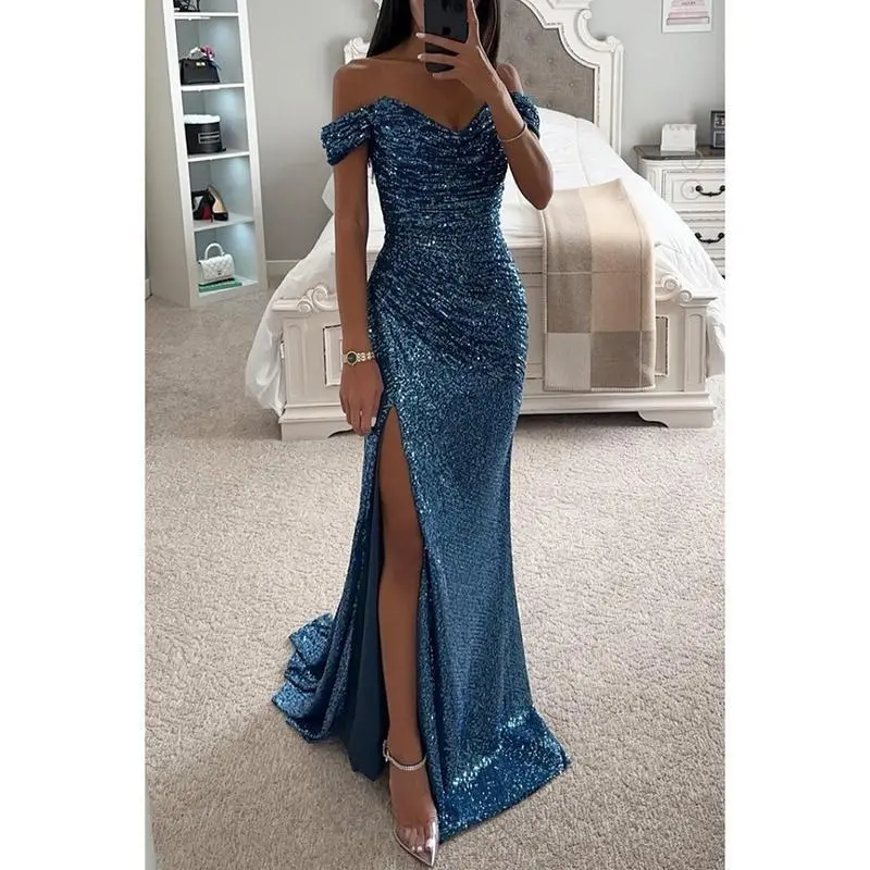 2025 Party Sequin Off-Shoulder Slit Dress Formal Casual