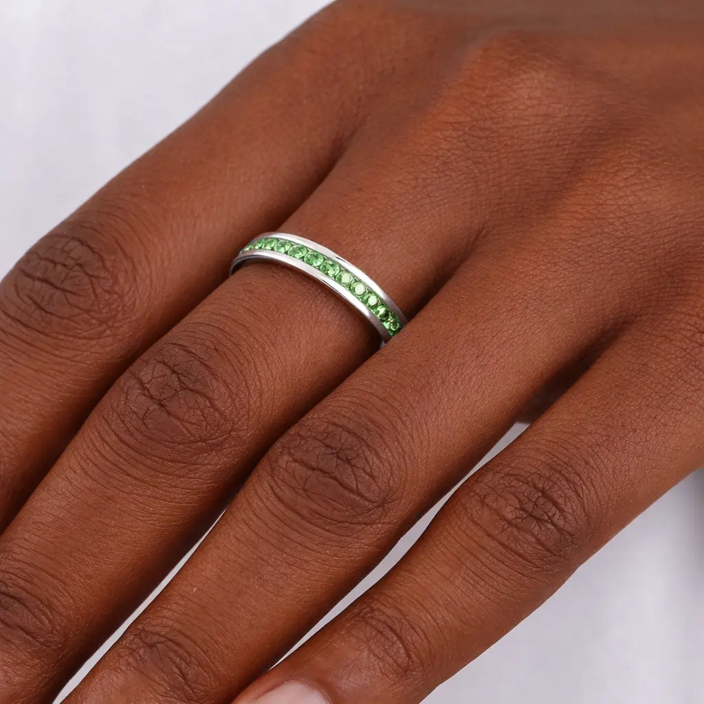 This ring features a captivating peridot crystal, perfect for stacking. Its sleek design complements any outfit. Ideal for those seeking a versatile accessory.