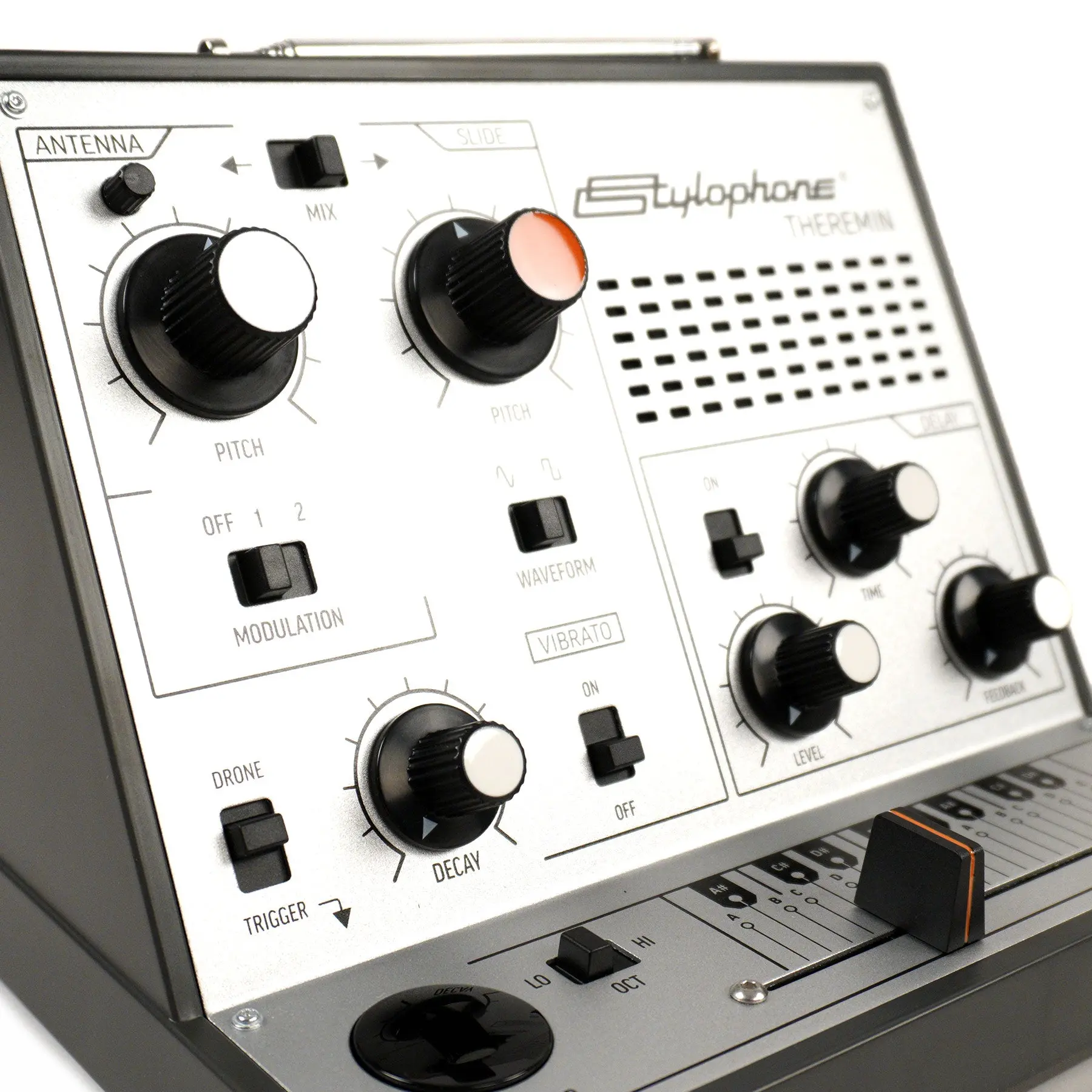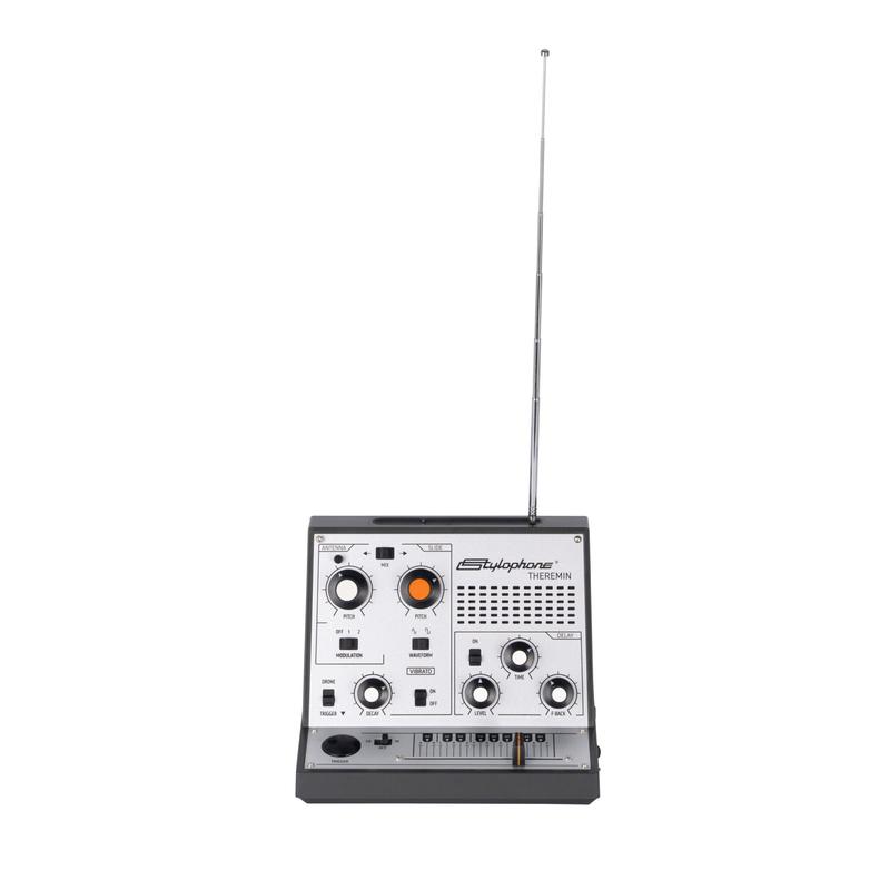 "The Stylophone Theremin is a portable touch sensitive synthesizer that creates experimental sounds by detecting your movement. Wave your hand around its antenna, move its slider from side to side, and go over the edge with mad modulation, wobbly vibrato, and crunchy echoing delay for crazy, quirky, sci-fi sound creation. Whether you’re a music maker, a beginner synth enthusiast, or you just want to have fun making noise, the Stylophone Theremin is a pitch only Theremin and takes the retro analog sound of a synth icon and makes it wilder than ever." - Stylophone