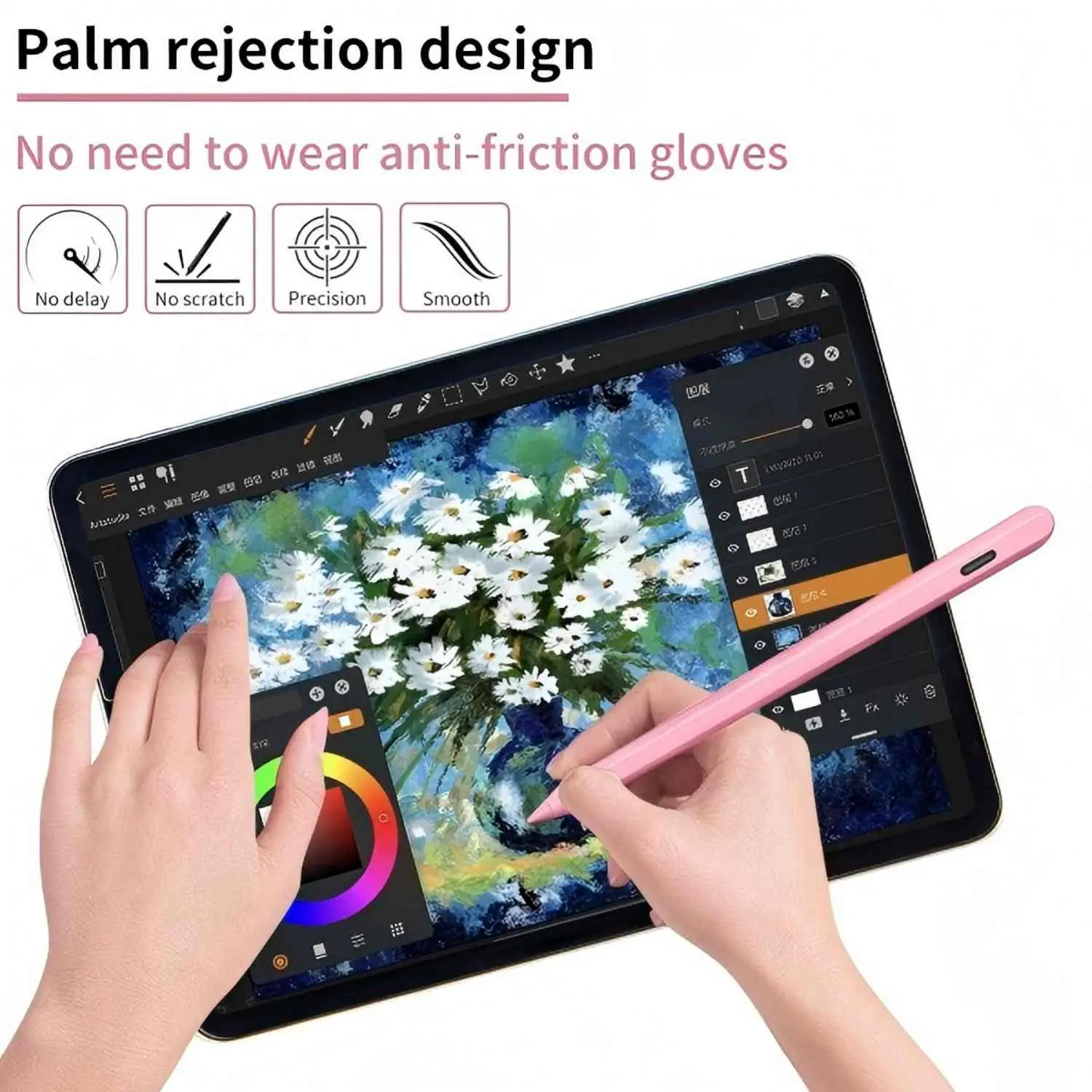 Support Palm Rejection Palm rejection is a feature that allows a device like a tablet to differentiate between a stylus or a fingertip and a palm or a wrist, effectively “rejecting” unwanted contact. A device and its software employ a variety of advanced algorithms to figure out which inputs are intended by the user . No need to wear anti-friction gloves as you can rest your hand on the screen without worrying about accidental touches. Support Angle/Tilt Sensitivity This feature is useful for drawing and writing applications that require different line thicknesses or shading.1.5mm Fine Tip& High Sensitivity