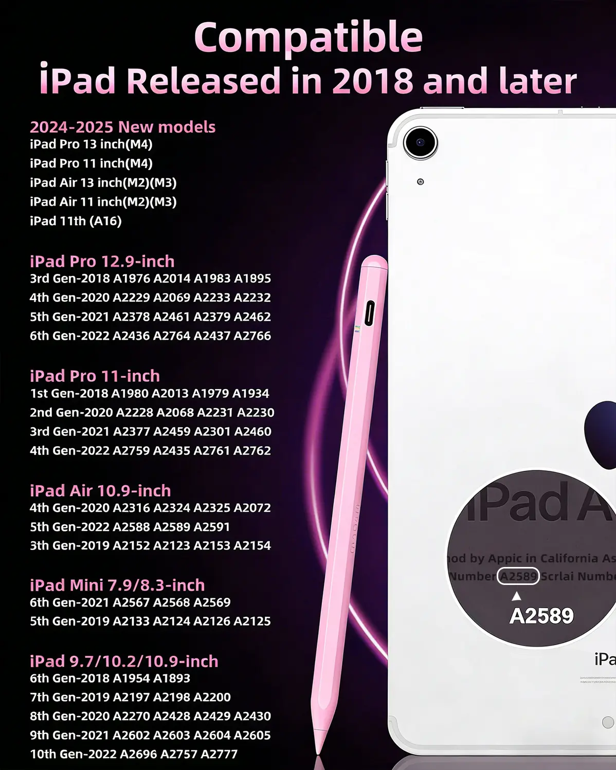 The Pencil is ONLY compatible with ipads released in 2018 or Later. Here are compatible Model name list:For iPad 10th/9th/8th/7th/6th Gen,iPad Pro 13" (M4),iPad Pro 11"(All Generations), iPad Pro 12.9"(3rd/4th/5th/6th),iPad Mini 6th/5th Gen, iPad Air 6th/5th/4th/3rd Gen. **Please go to [Setting>General>About] to confirm your iPad's model name before placing order. NOT Compatible with other ipad models or any other brand touchscreen devices