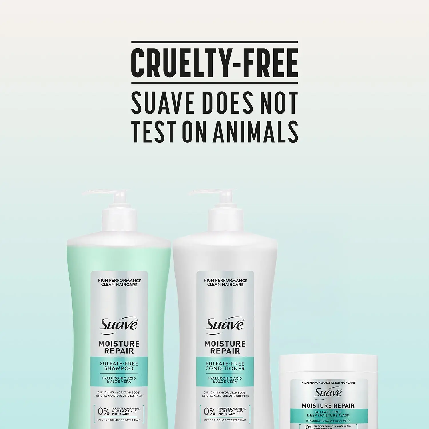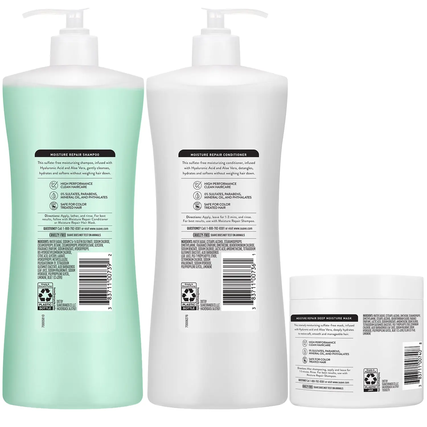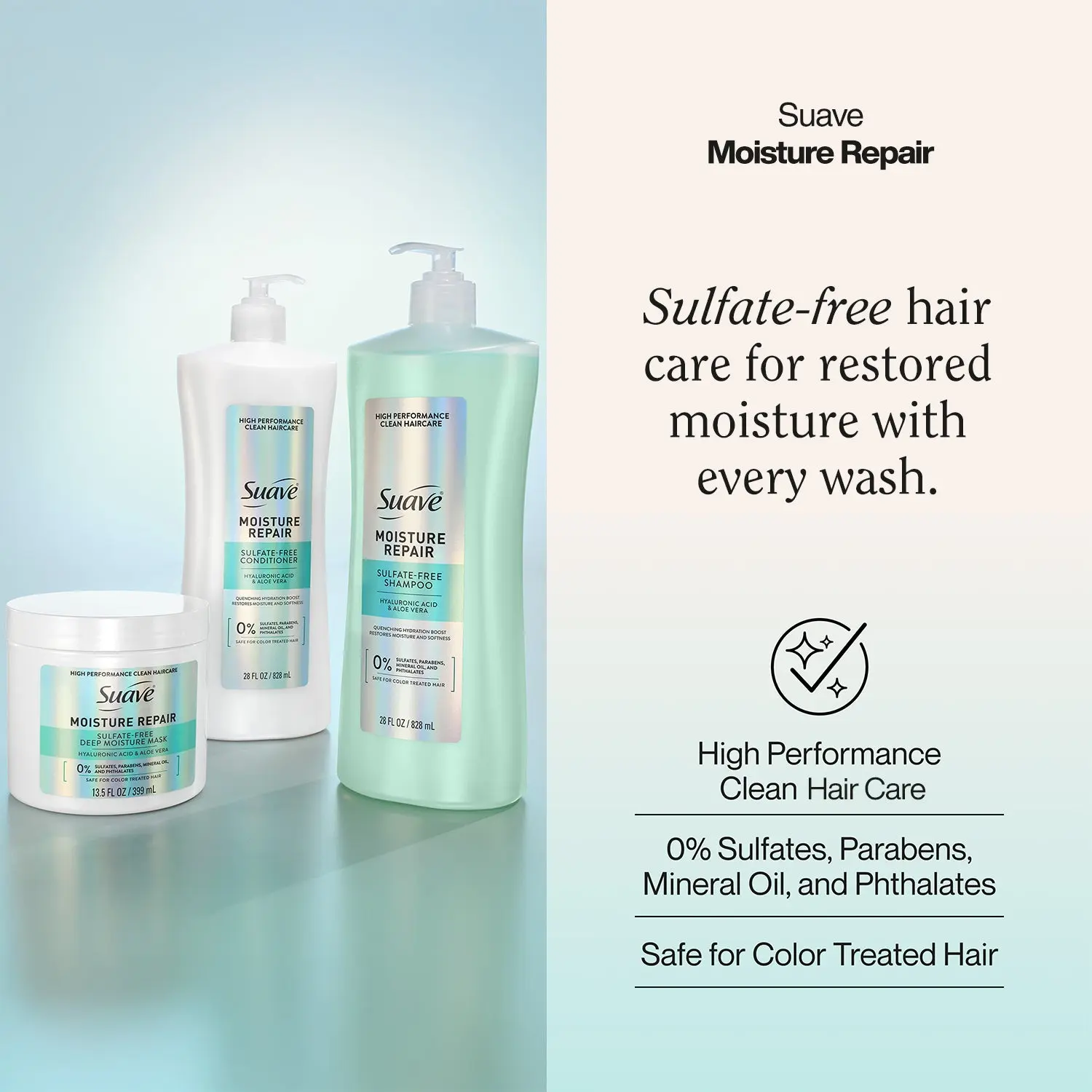 Restore moisture and softness in one easy routine with the Suave Moisture Repair Shampoo and Conditioner Set (28 oz ea) plus Deep Moisture Mask (13.5 oz). This trio of new Suave hair products, infused with hyaluronic acid and aloe vera, helps soften, smooth, and restore dry, damaged hair in minutes.