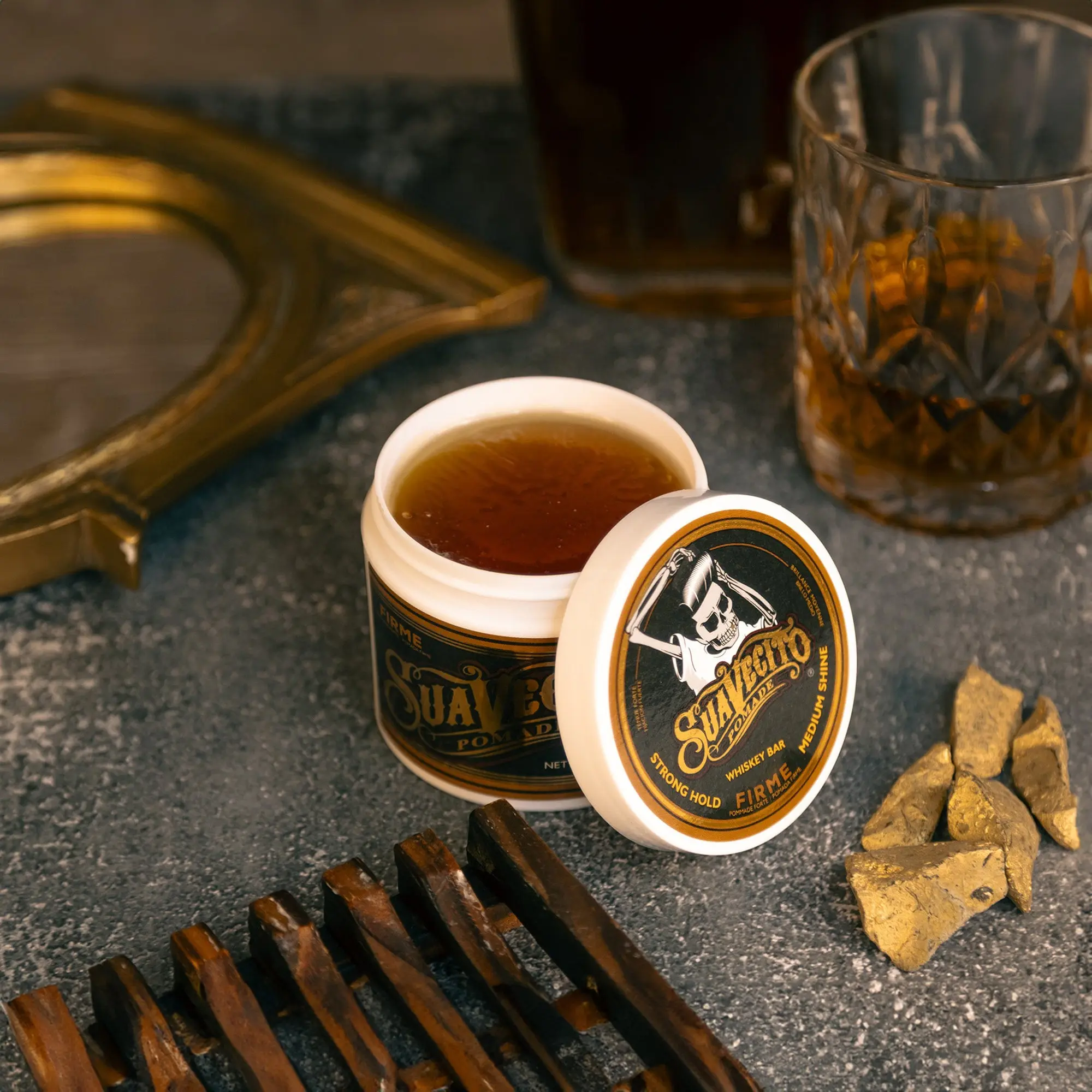 Introducing the Suavecito Firme (Strong) Hold Pomade in the tantalizing Whiskey Bar scent. This premium pomade combines unbeatable hold with a distinct whiskey aroma. It keeps your hairstyle in place all day, offering confidence for any challenge. Perfect for classic or modern styles, this pomade is your versatile grooming companion.