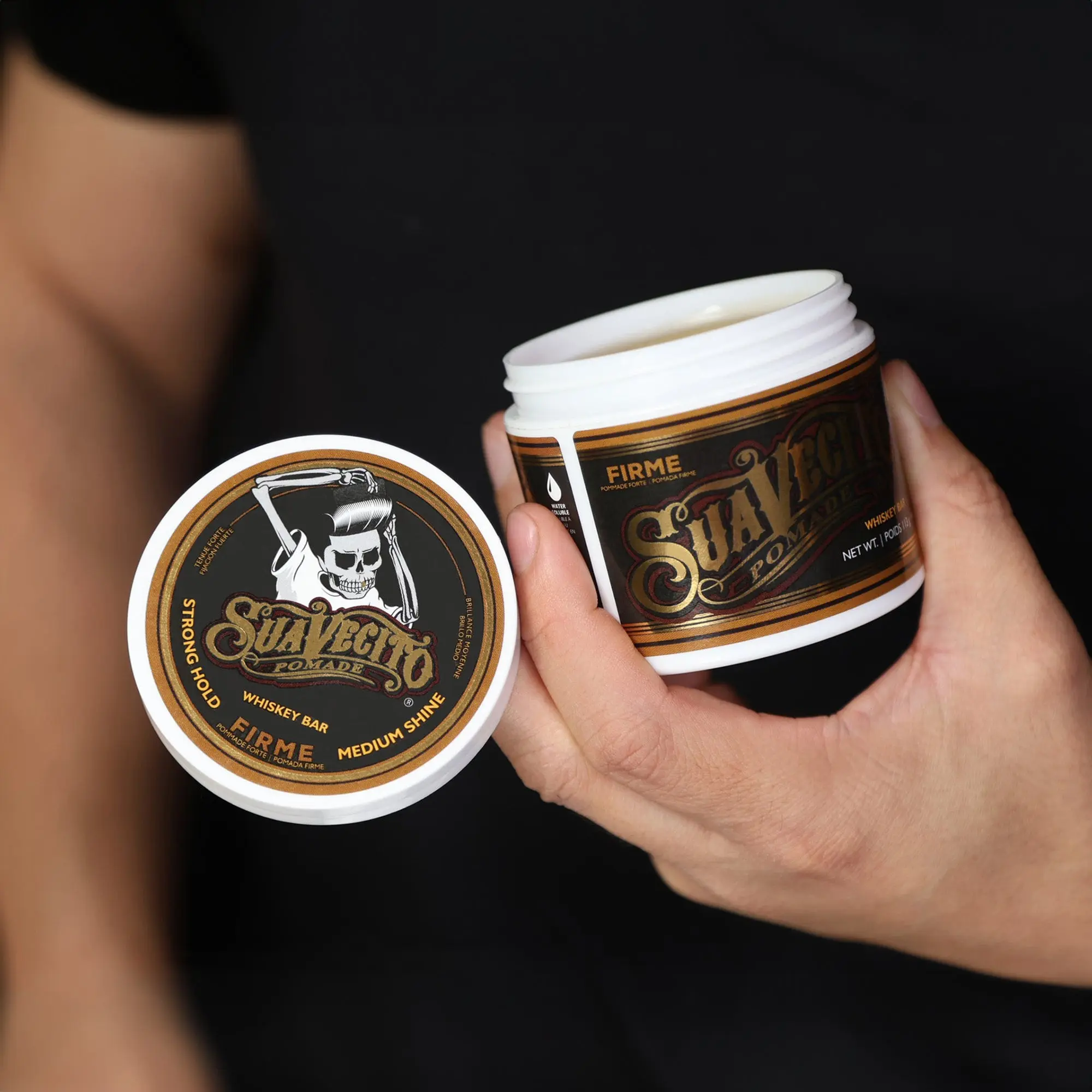 Introducing the Suavecito Firme (Strong) Hold Pomade in the tantalizing Whiskey Bar scent. This premium pomade combines the unbeatable hold of our Firme Hold formula with a deliciously distinct whiskey aroma, creating a grooming experience unlike any other. With its strong hold, this pomade keeps your hairstyle in place all day long, giving you the confidence to tackle anything that comes your way. Whether you're going for a classic slicked-back look or a modern textured style, this pomade has got you covered. Here are two key features that set this pomade apart: Unbeatable hold: Our Firme Hold formula is designed to keep your hair in place, no matter what. Say goodbye to unruly hair that doesn't stay put. Whiskey Bar scent: Immerse yourself in the intoxicating aroma of a whiskey bar with every application. This unique scent adds a touch of sophistication to your grooming routine. Crafted with the finest ingredients, this pomade not only holds your hair in place but also leaves it looking shiny and nourished. It is easy to apply and washes out effortlessly, saving you time and effort. Elevate your hairstyling game with Suavecito Firme Hold Pomade in Whiskey Bar scent. The perfect fusion of hold and aroma, this pomade will make you stand out from the crowd.