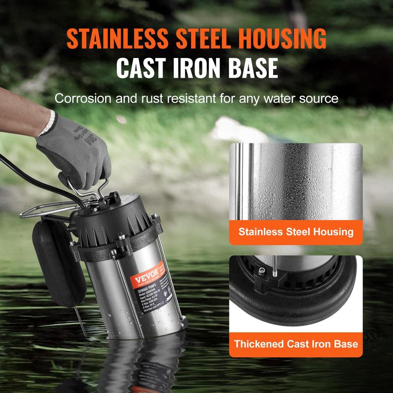 • Tough as Nails: To ensure longevity, we've assembled our submersible sewage pump with a stainless steel body and cast iron housing, both known for their high wear and corrosion resistance. With an IPX8 waterproof rating, it's ready to tackle the tough environments.