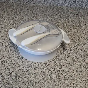 3 PIECES SET: Includes 1 suction toddler bowl and a Mighty Grip handle fork and spoon ON-THE-GO: Includes lid to safely protect and store meals. SELF FEEDING FRIENDLY: Ideal size and shape. Designed with tall curved sides to help toddlers during self feed learning stage. MESS FREE: Permanently attached strong suction base helps prevent spills DISHWASHER & MICROWAVE SAFE: Remove lid before heating in microwave BUILT IN UTENSILE STORAGE HEAT RESISTANT: Silicone grips CAPACITY: 13.5 fl. oz. (400ml) BPA-FREE Product Dimensions: 6.5 x 3 x 6 inches Weight: 0.5 lbs   WARNING This item may become a choking hazard. Microwave heating may produce uneven hot spots. Always use adult supervision when heating food and when allowing children to handle suction bowl and spoon