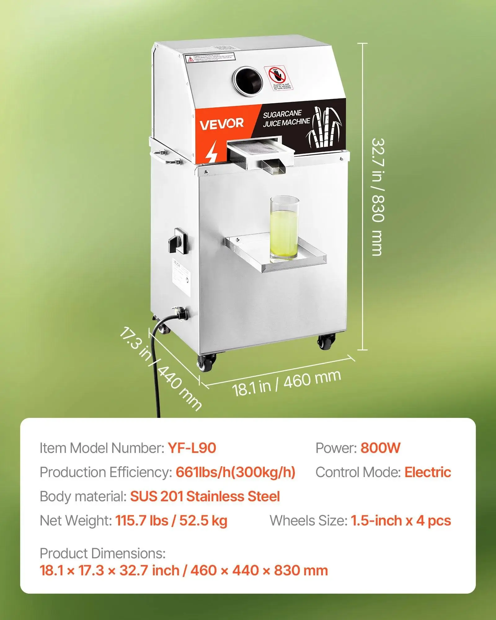 VEVOR electric sugar cane juicer boasts an 800W powerful motor and 3 stainless steel rollers. This setup ensures effortless and efficient sugarcane juicing. With a 661LBS/H high productivity, it maximizes juice output. The juicer extracts pure and smooth sugarcane juice, delighting your taste buds. Perfect for both home and commercial use.