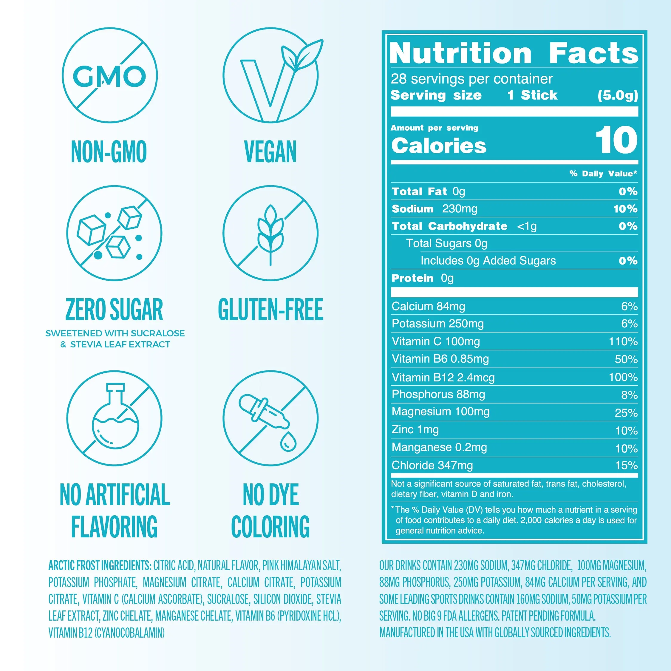 • 6 key electrolytes: magnesium, sodium, potassium, chloride, phosphorus, and calcium. These support hydration, recovery, and overall performance.