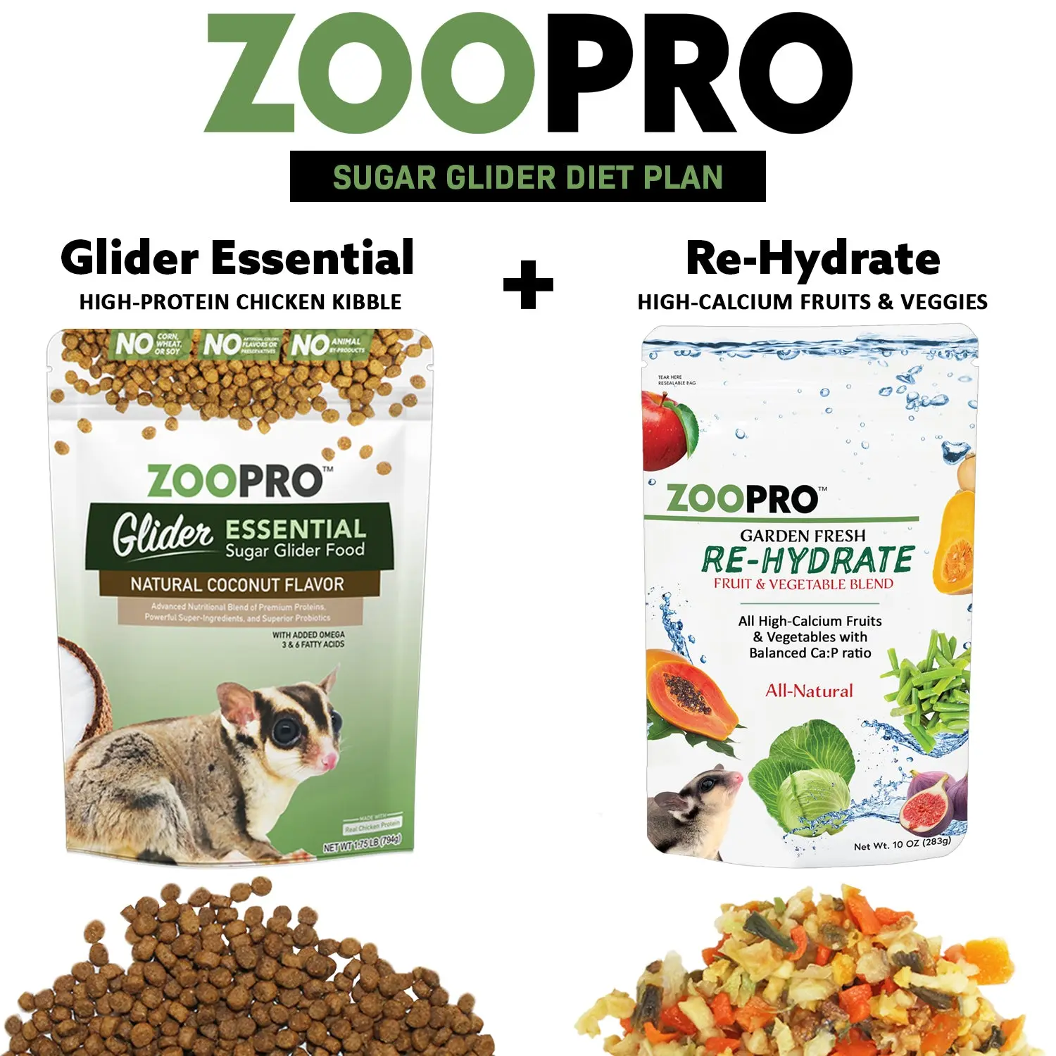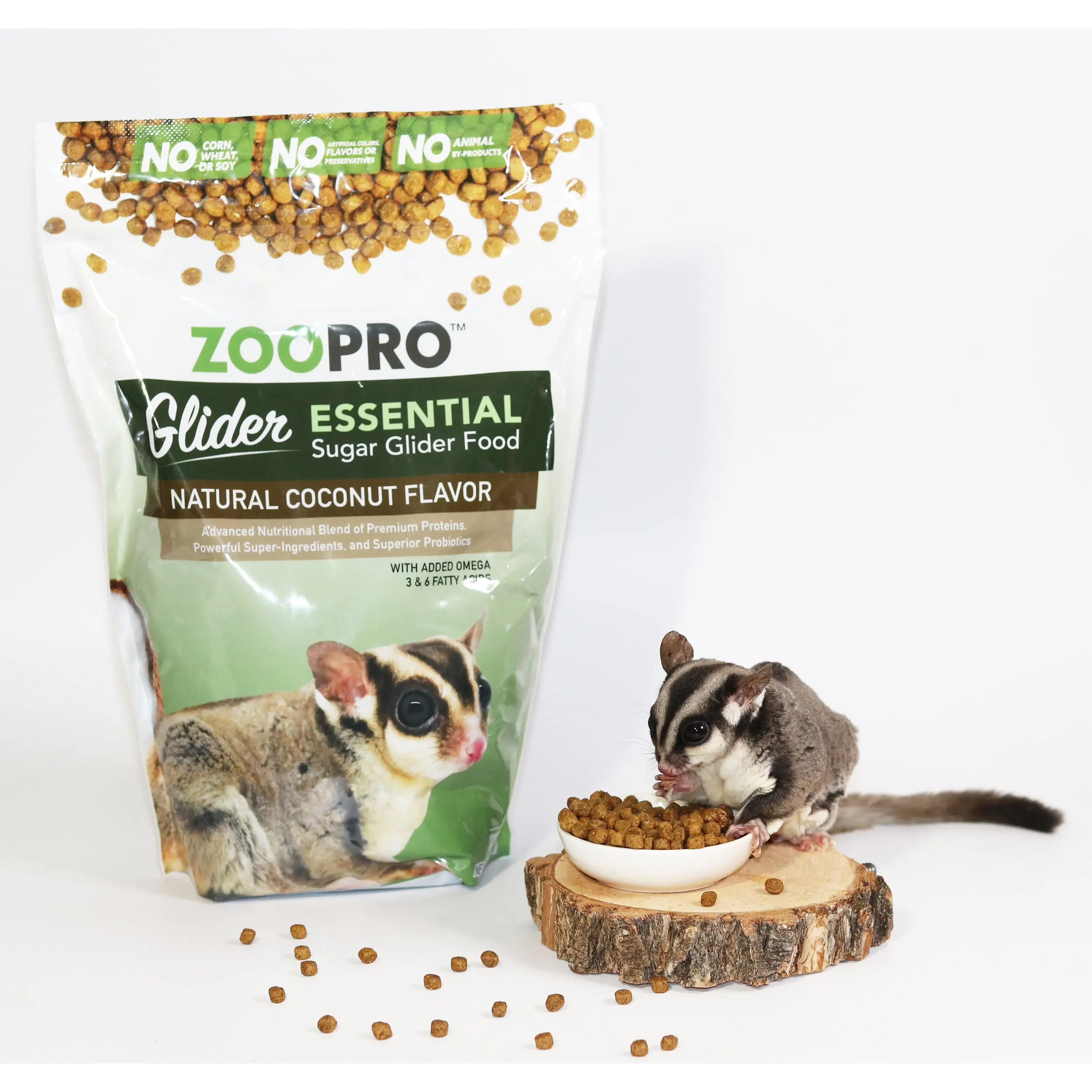 ZooPro Glider Essential sugar glider food is highly palatable containing protein-rich whole eggs & chicken along with the proper vitamin and mineral levels to form a nutritionally balanced food. The crunchy texture helps to keep the teeth clean and healthy, a quality food for all age (juvenile through adult age) sugar gliders. This healthy diet uses only the highest quality nutrient-rich ingredients and no unnecessary fillers. Glider Essential bite-size kibble is nutritionally packed with a coconut flavor that is sure to be a hit with even the pickiest suggie!