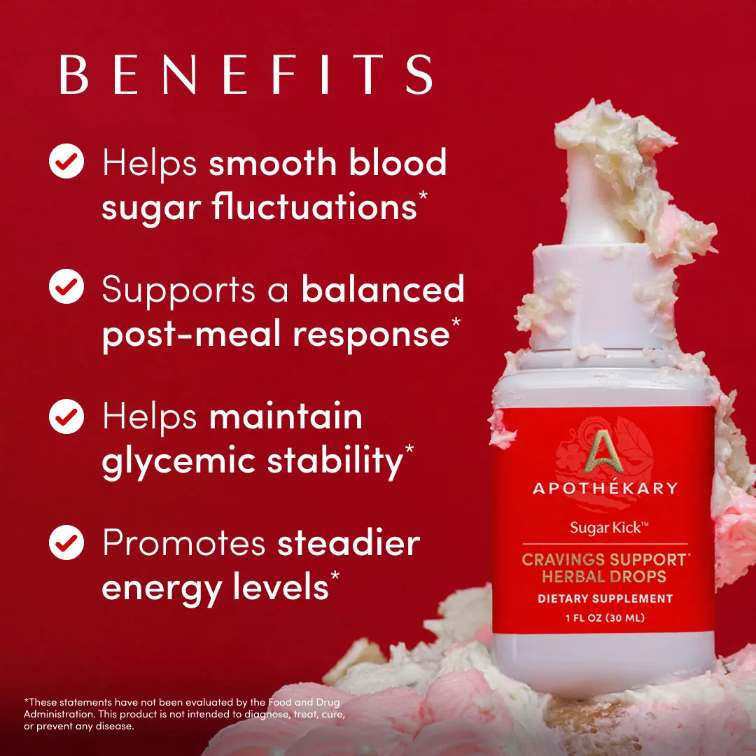 Sugar Kick by Apothékary is a potent tincture featuring Japanese-inspired ingredients that help ease unwanted cravings, support balanced energy, and let you savor life’s simple joys throughout the day. *