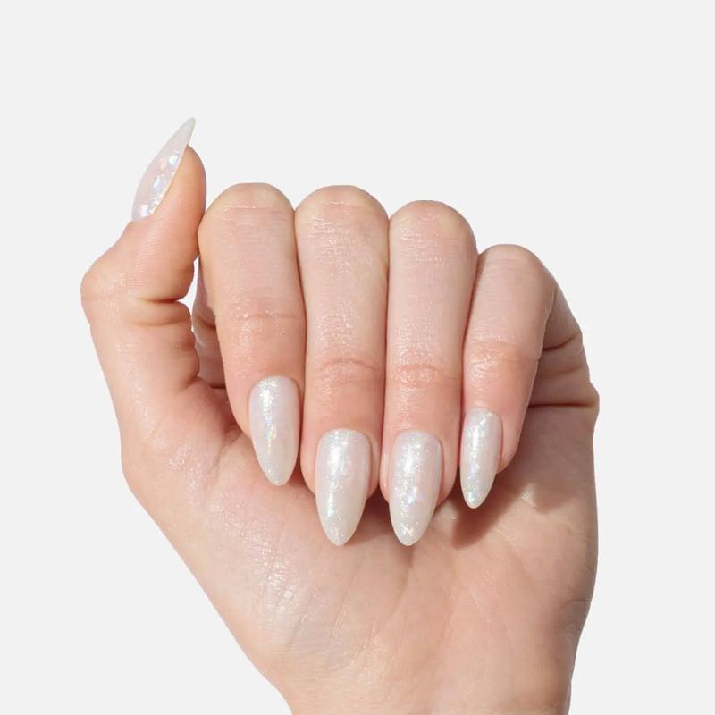These are a beautiful iridescent pearl color. I love how you can see a rainbow effect as they catch the light. Almond is my favorite shape.