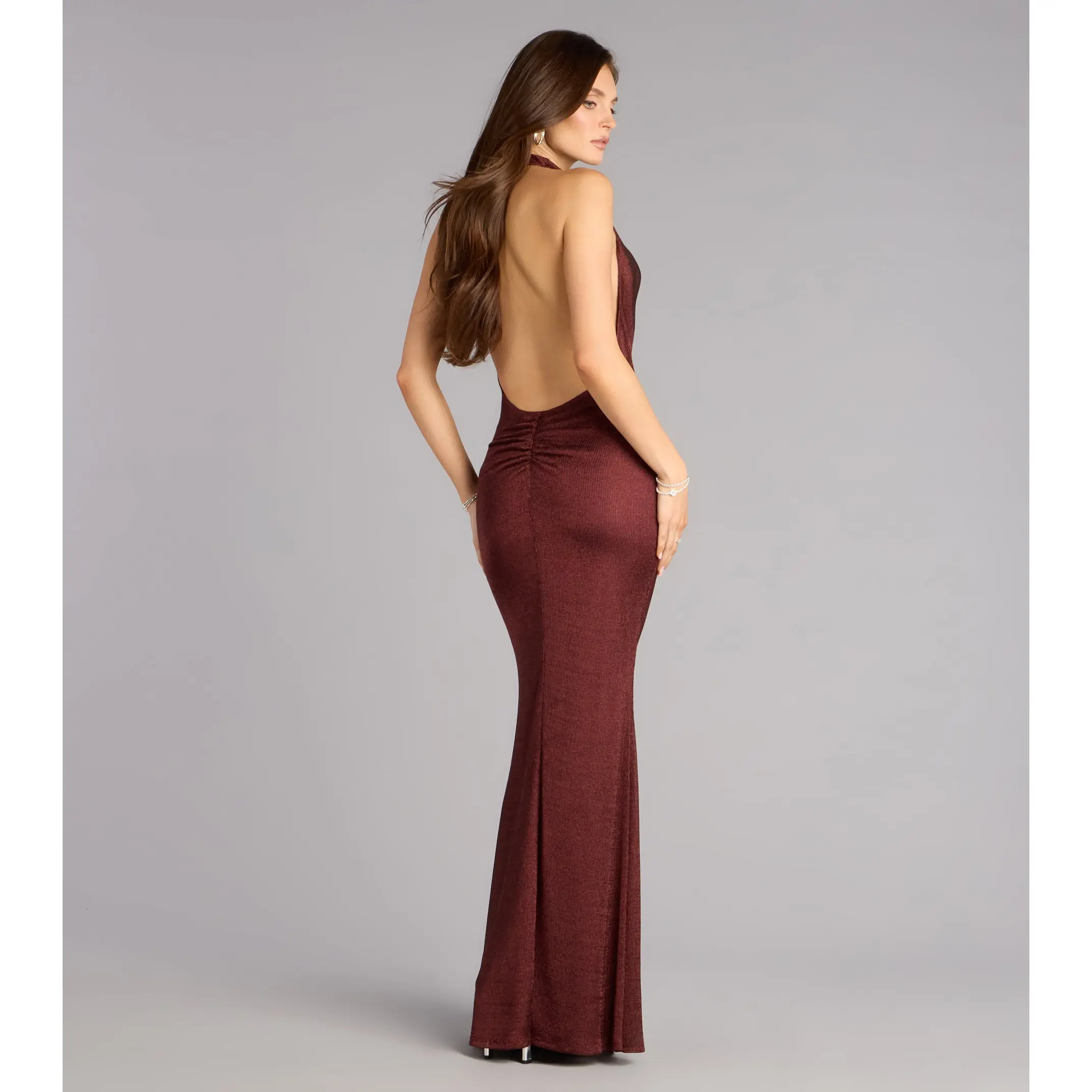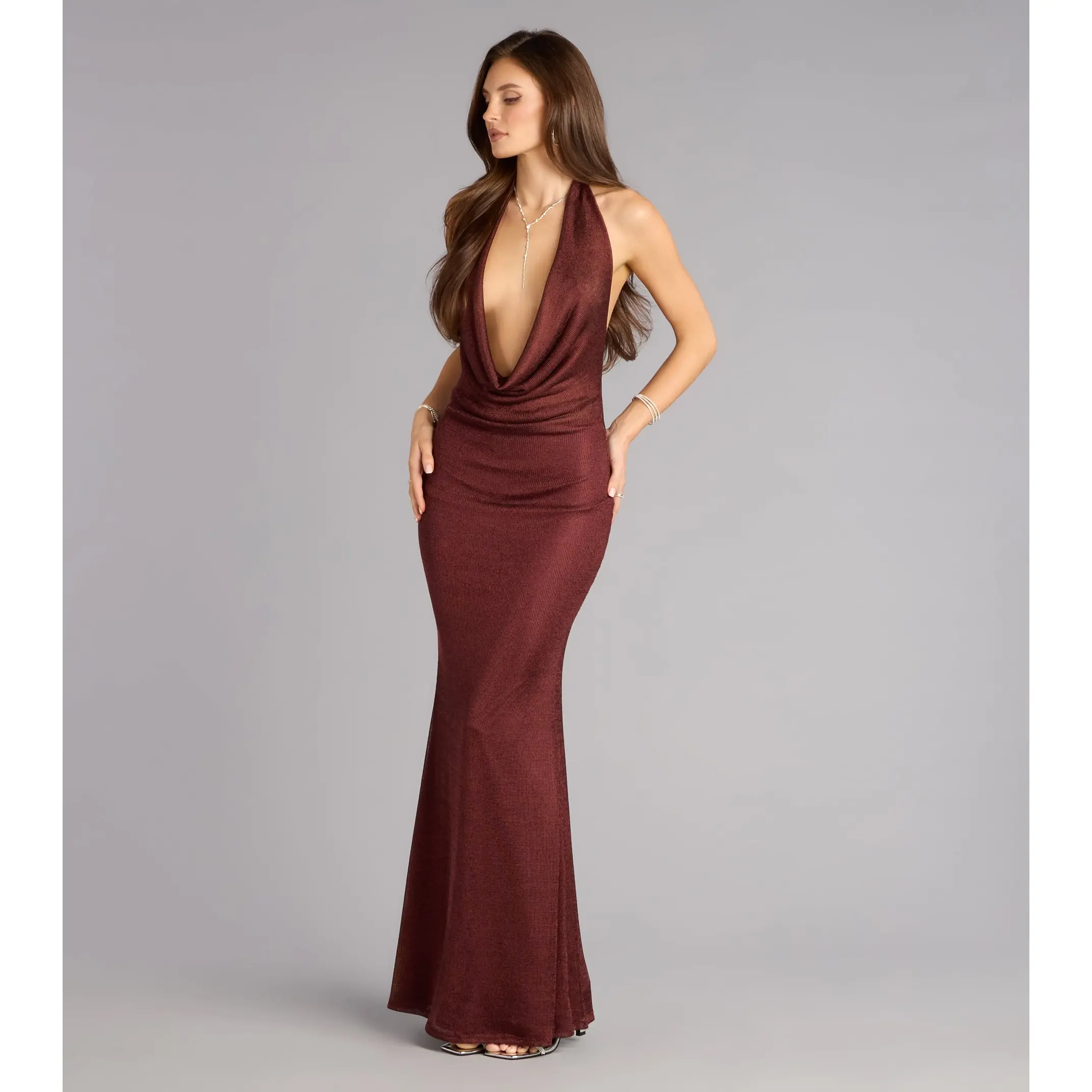 This dress does subtle the bold way—sleek metallic shimmer, a daring plunge, and an open back that knows exactly what it’s doing. It’s the effortless kind of sexy that turns a simple walk into a slow-motion moment.