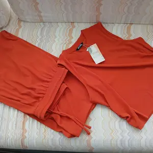 Absolutely love this adorable 2 piece outfit. Has a perfect weight and drape that can be both business crisp and casual evening out. Fabric is ribbed and has a very polished look to it.