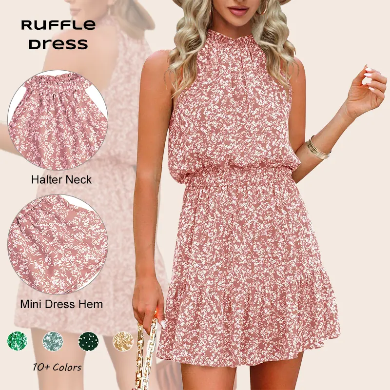 ·FEATURES - Dresses For Women / Boho Dresses For Women / Retro Aline Dresses For Women / Allover With Stylish Pattern: Solid,Graphic / A Keyhole Connect With The Halter Neckline / Backless / Sleeveless / Moderate strings Waistband / With Tie-Self Belt / Swing Ruffle Hem / Soft Fine-Knit Viscose Material