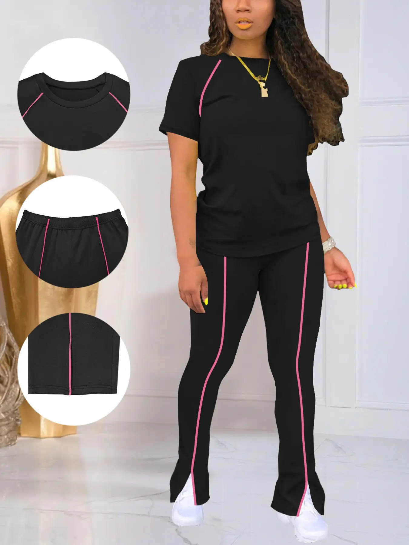 5. Summer Fashion New Round Neck Solid Color Striped Patchwork Short Sleeve Fitted Top with Long Pants Set, Women's Two-Piece