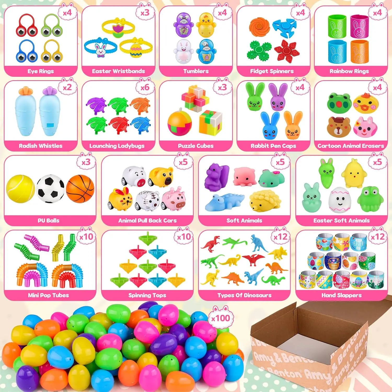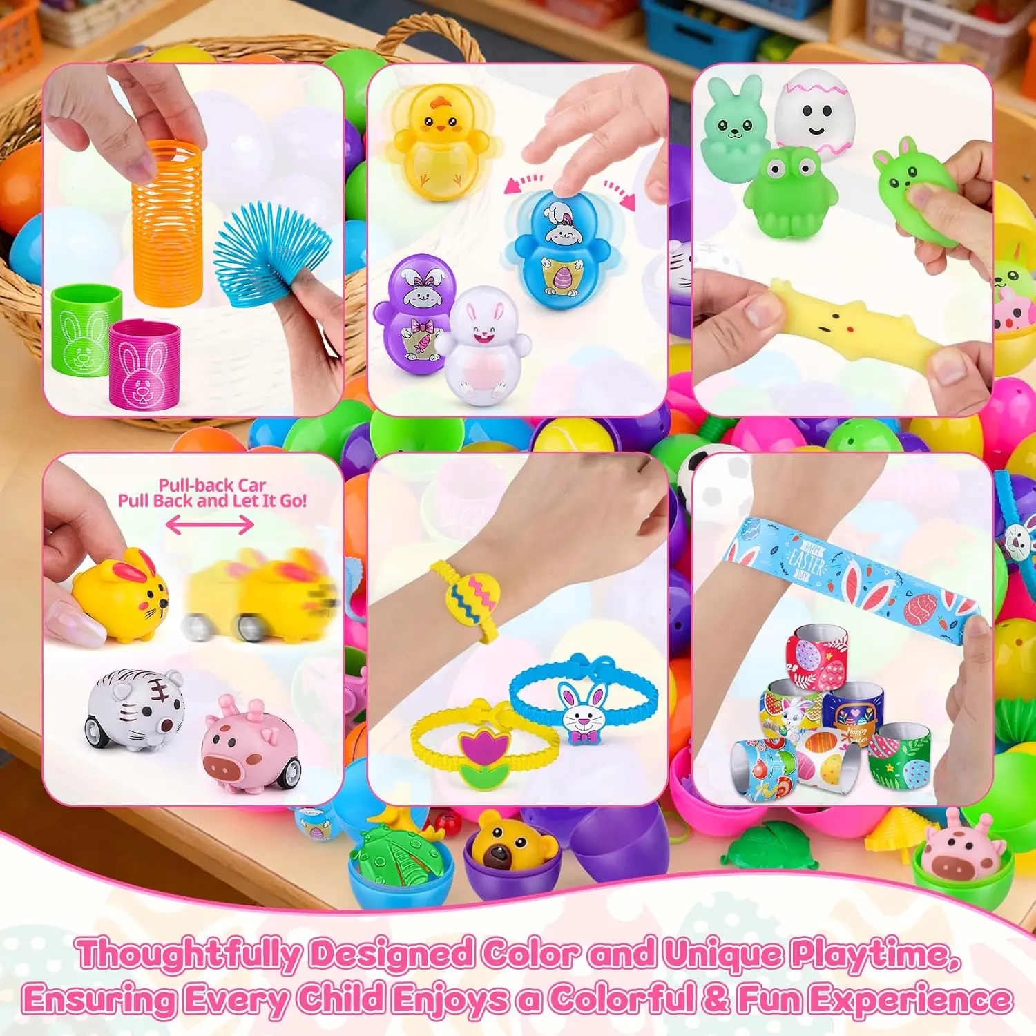 100 Prefilled Easter Eggs – Includes a huge variety of surprise toys such as dinosaur figures, pull-back cars, finger spinners, puzzle keychains, rainbow springs, stretchy tubes, slap bracelets, squishy toys, spin tops, whistles and more – perfect for Easter basket stuffers and egg fillers.