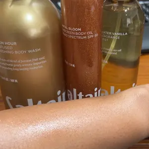 Smells amazing, scent last all day from the body wash to the body mist. The body oil is light, not sticky and brings your true color tone to life. The bonus is the SPF 50 Sunscreen ❣️