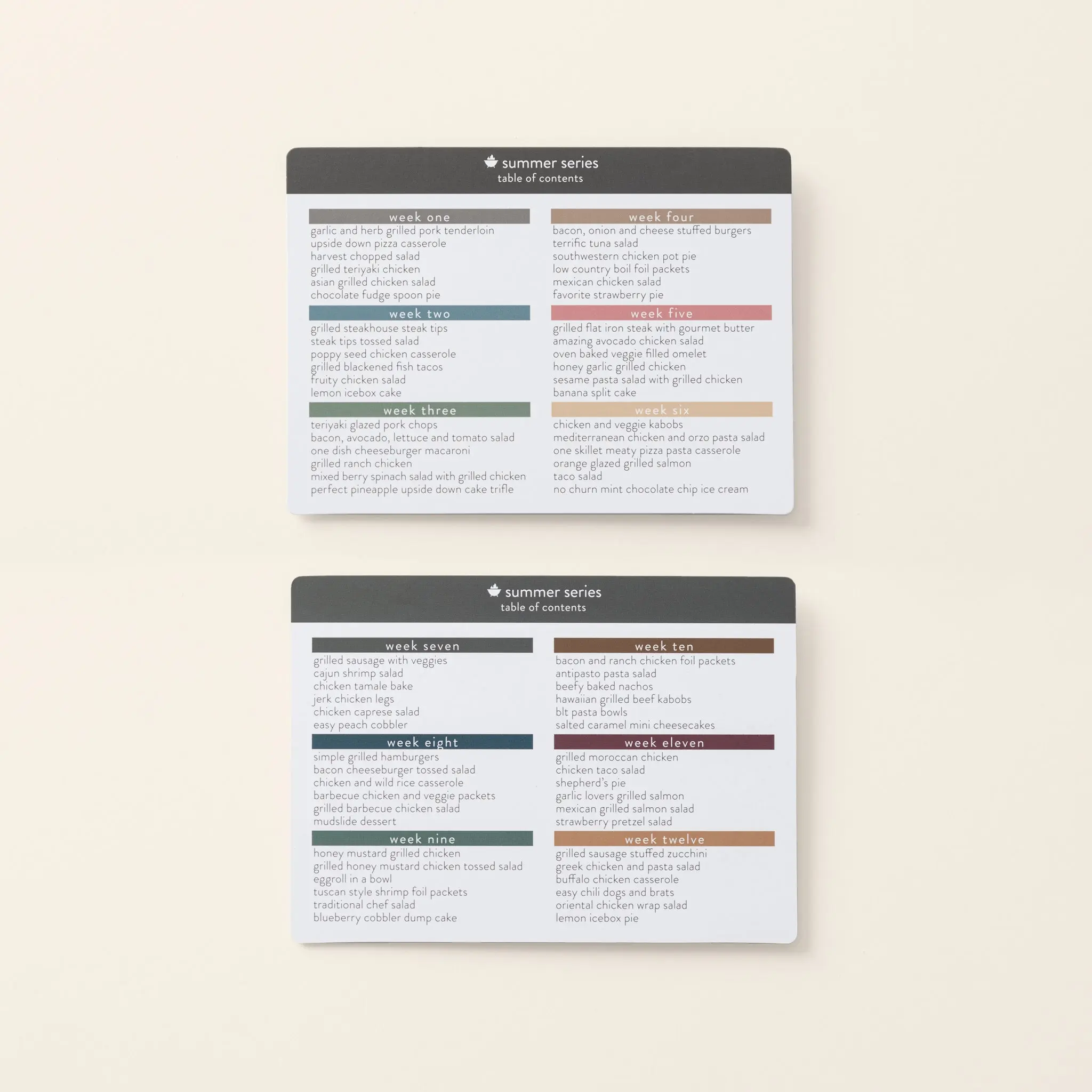 The plan offers light summer casseroles, hearty summer salads, easy grilling meals, and simple desserts. It also includes 10 "cook once, eat twice" recipes using the main protein. 🍽️
