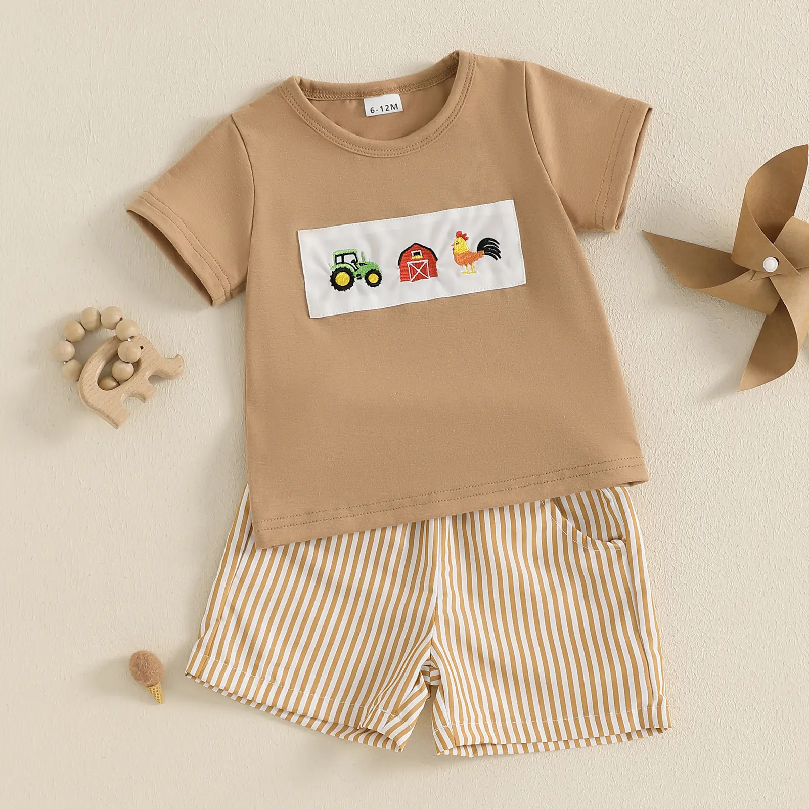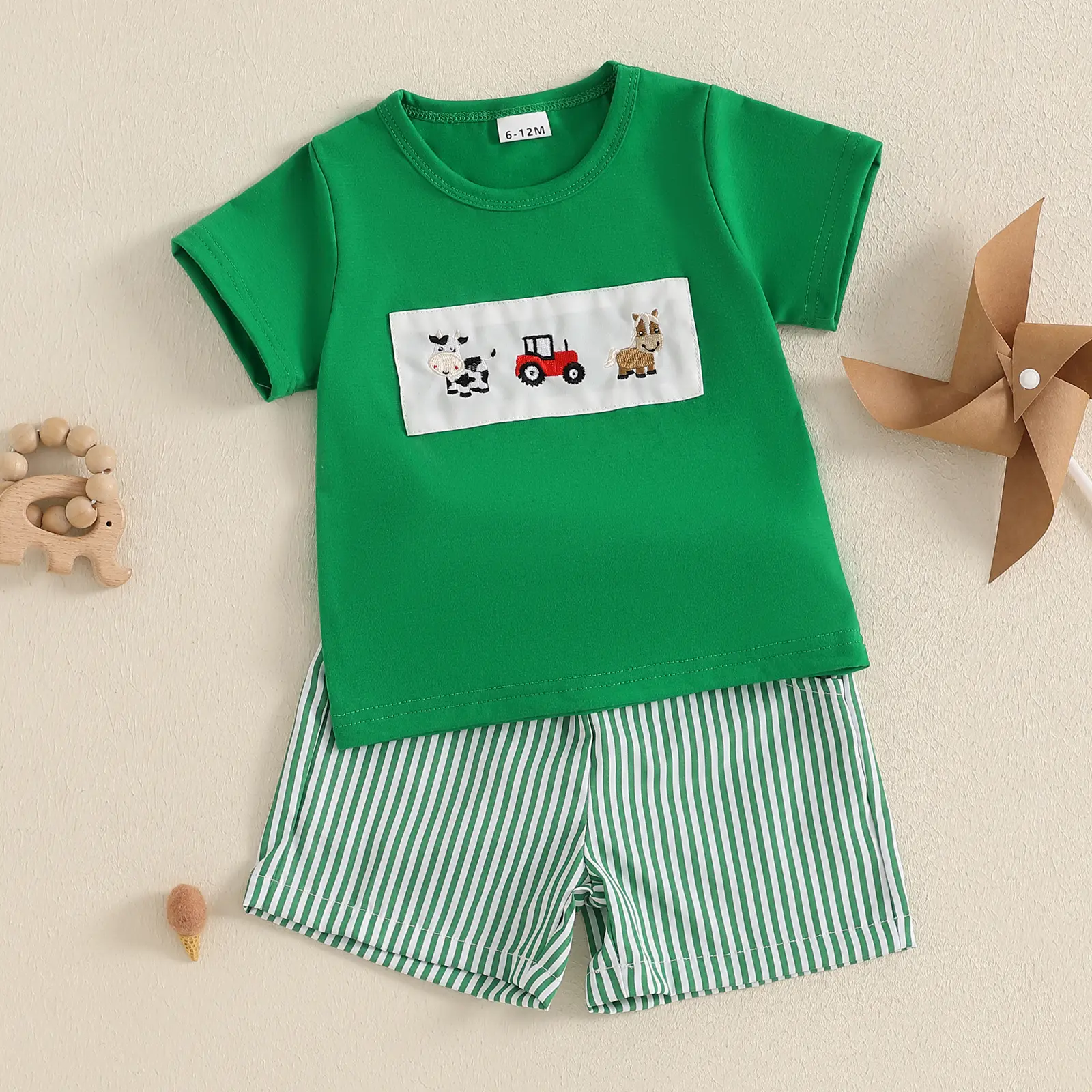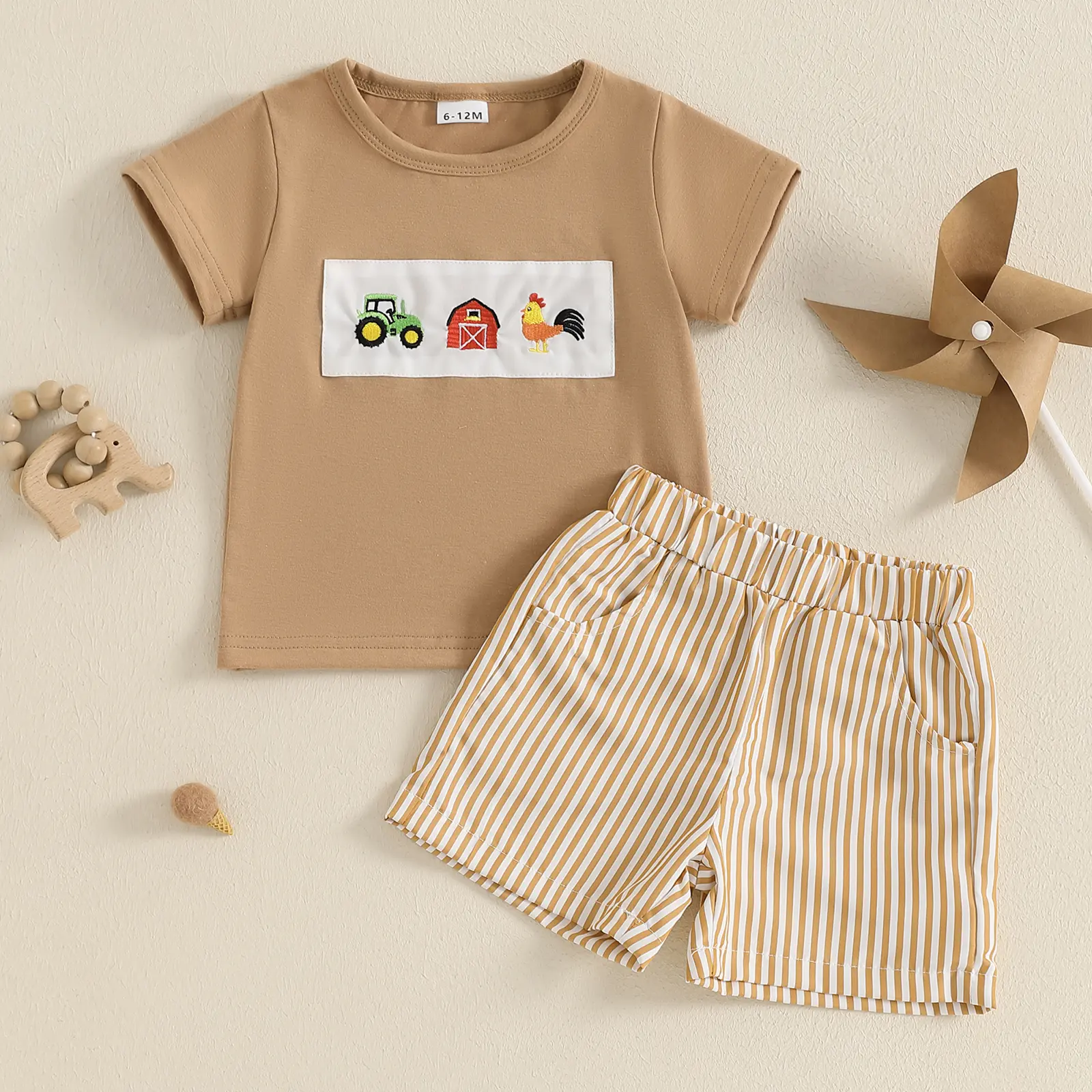 Toddler Boy Summer Outfits Animal Embroidery Round Neck Short Sleeve Tops with Stripe Shorts Outfit