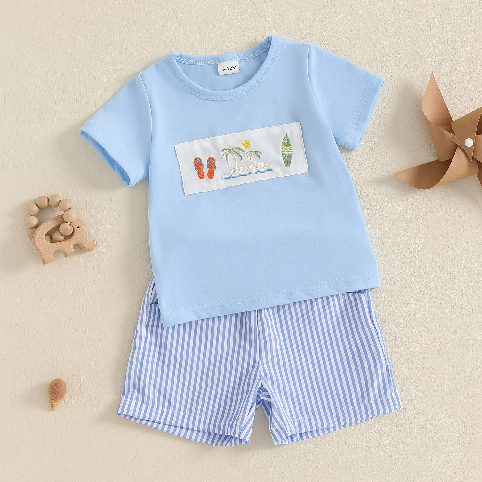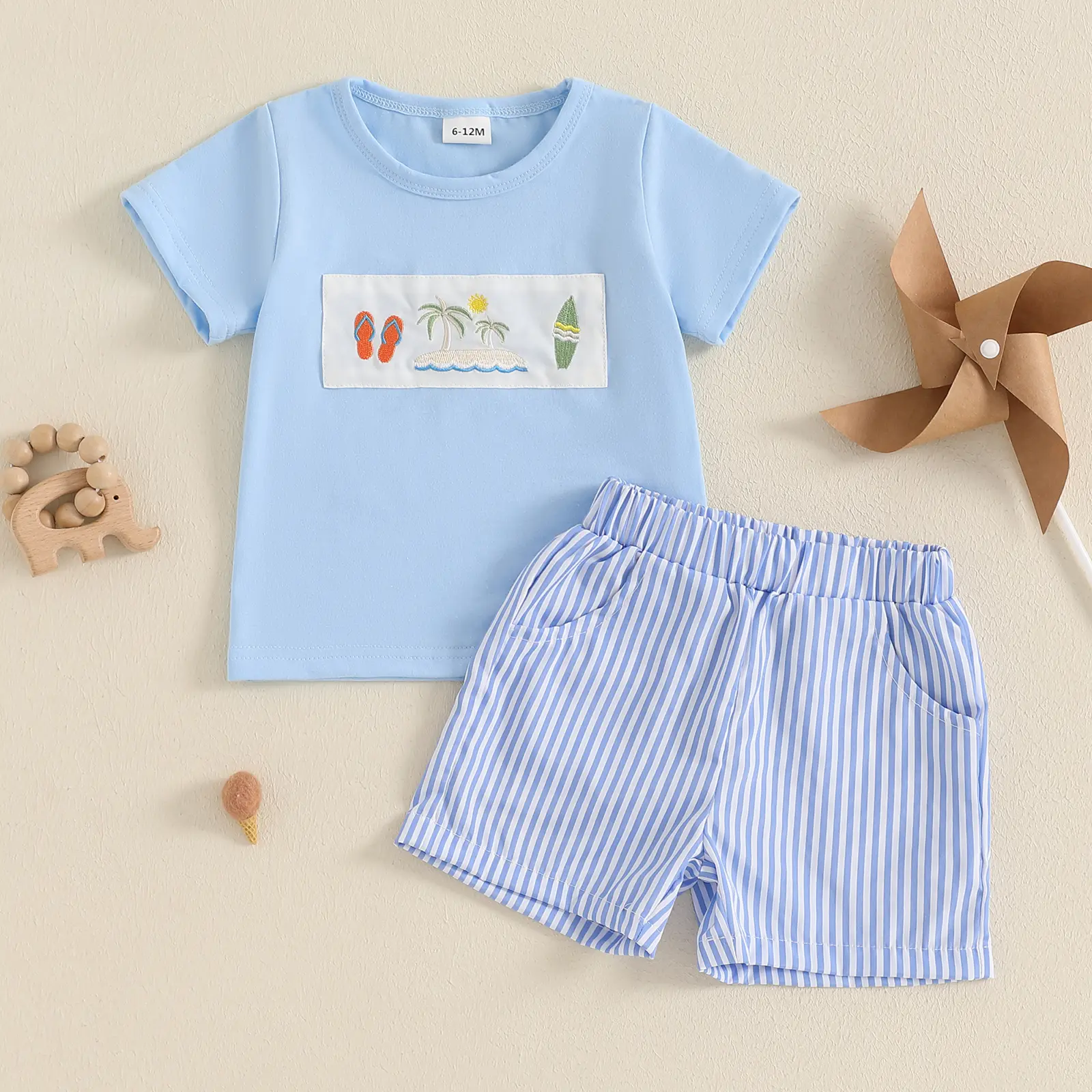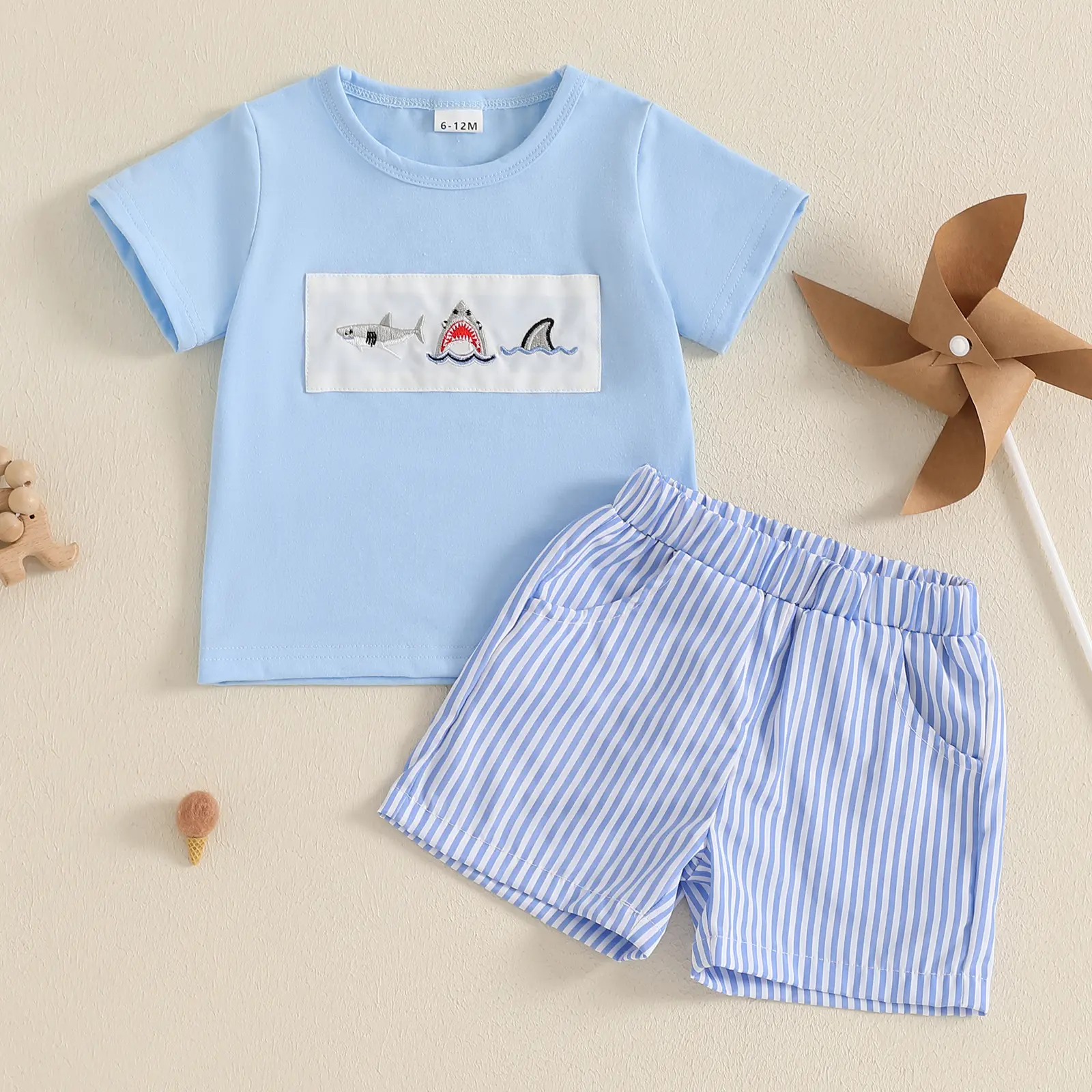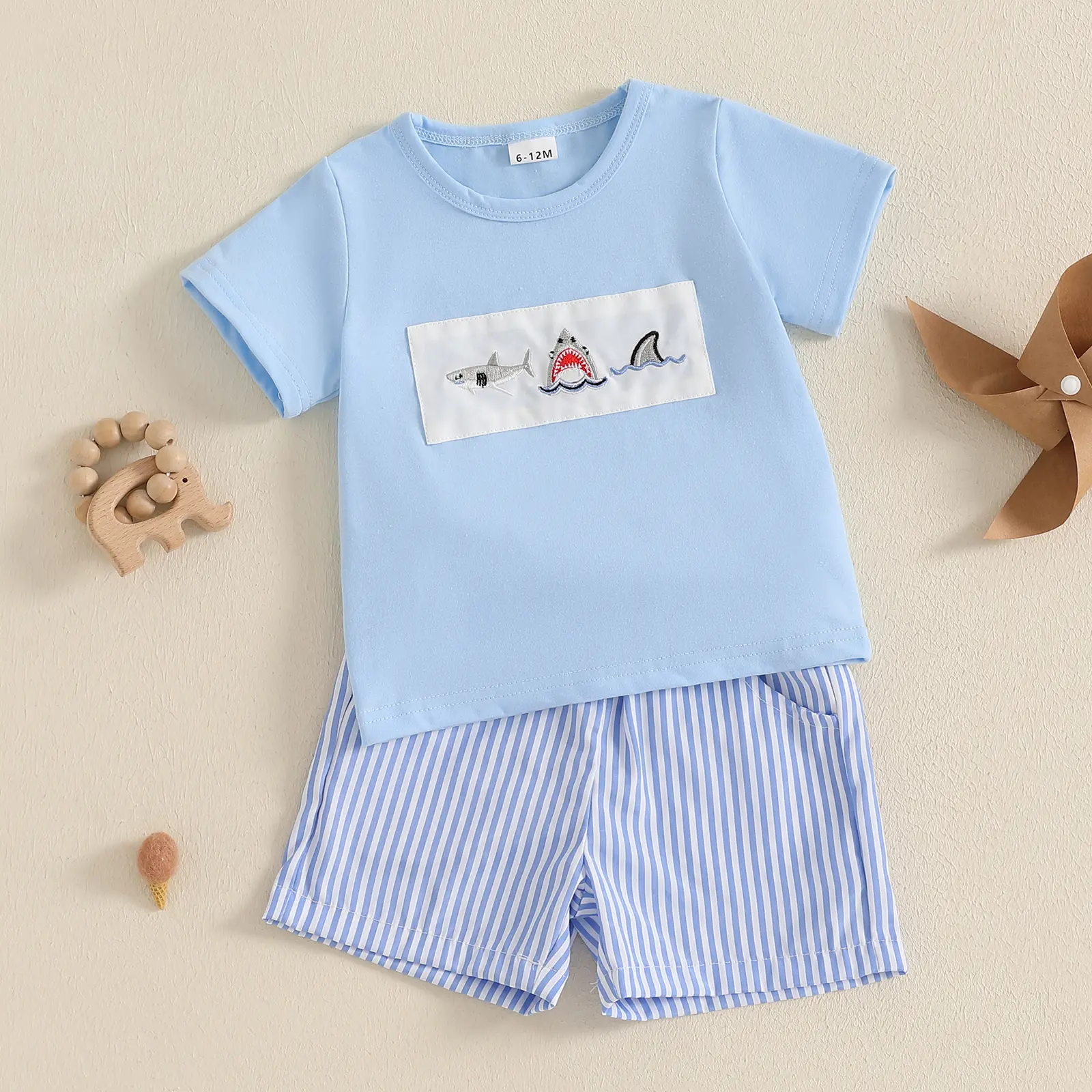 Toddler Boy Summer Outfits Animal Embroidery Round Neck Short Sleeve Tops with Stripe Shorts Outfit