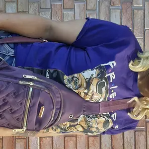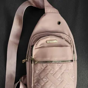 Characteristics: Nice design with gold accents and features a slot for headphone 🎧 cord. Hands free crossover bag, great for travel. 4 compartments not including small one inside.