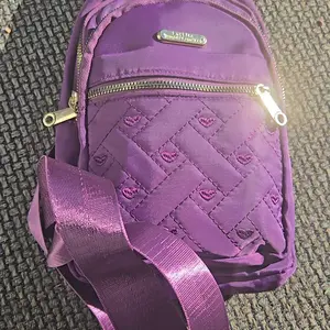Small and crossbody bag. Can be used to store your wallet, cellphone and snack during a trip any casual outing. I recommend!💜
