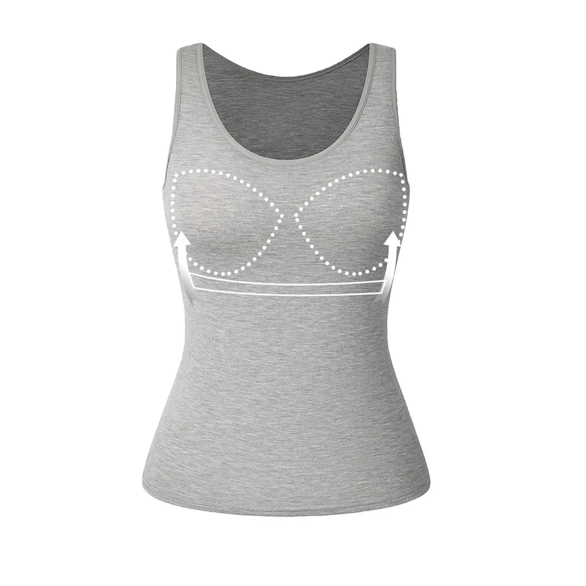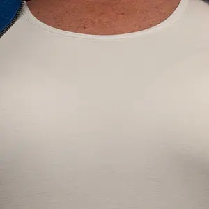 The fabric on this shirt is translucent and practically see-through. It is so thin that you can see the built-in bra and the pads through the fabric on the white shirt. I would not recommend this top. You can wear it on as an undershirt, but I would not wear it out by itself.