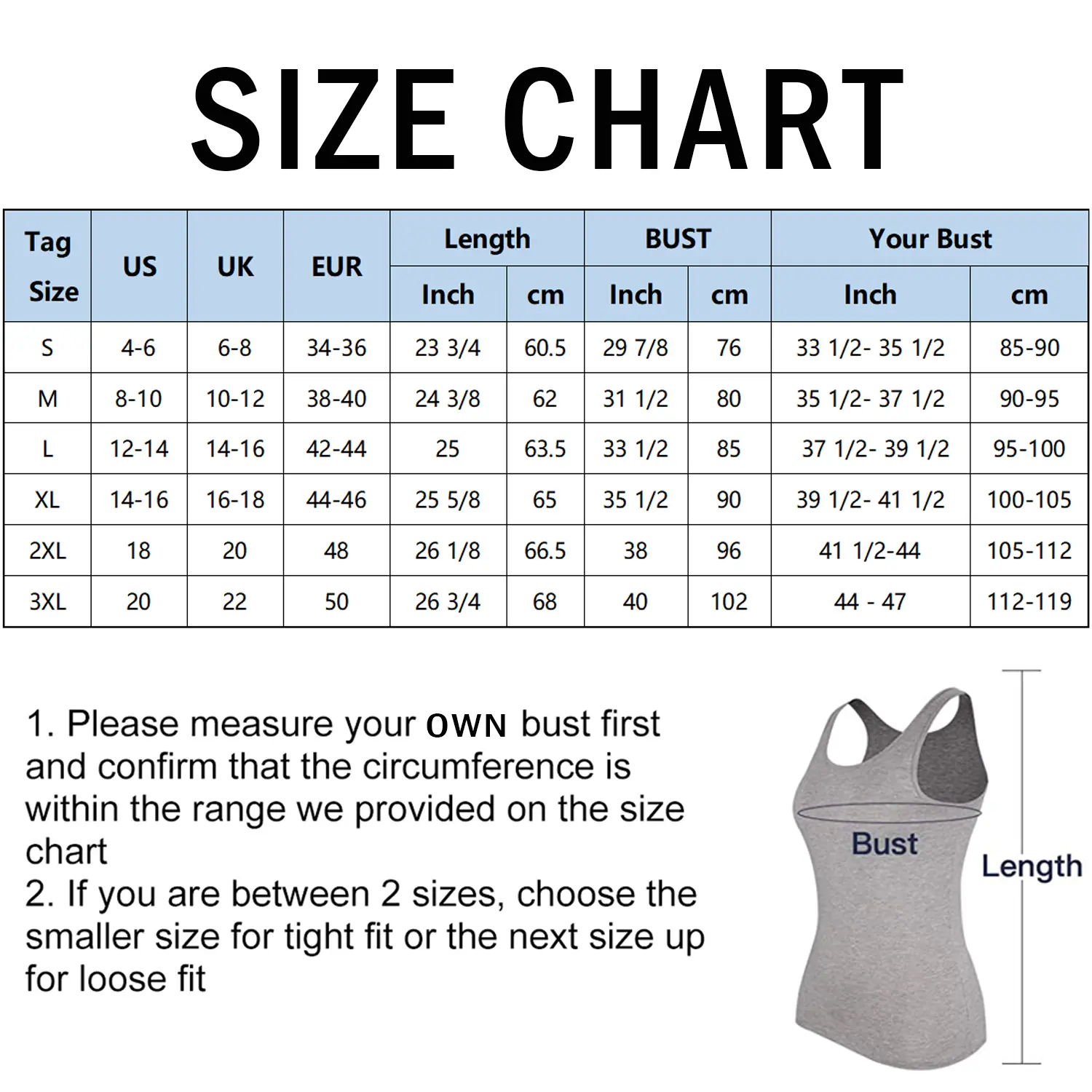Tank top runs very big. According to the sizing chart I was a large but I would have preferred the fit of a medium. Straps are not adjustable so the built in bra was very low fitting. I tried it on with an additional bra and it looked okay.