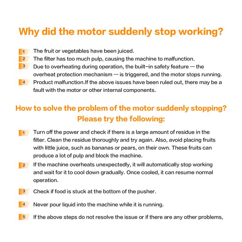 1. Turn off the power and check if there is a large amount of residue in the filter. Clean the residue thoroughly and try again. Also, avoid placing fruits with little juice, such as bananas or pears, on their own. These fruits can produce a lot of pulp and block the machine.