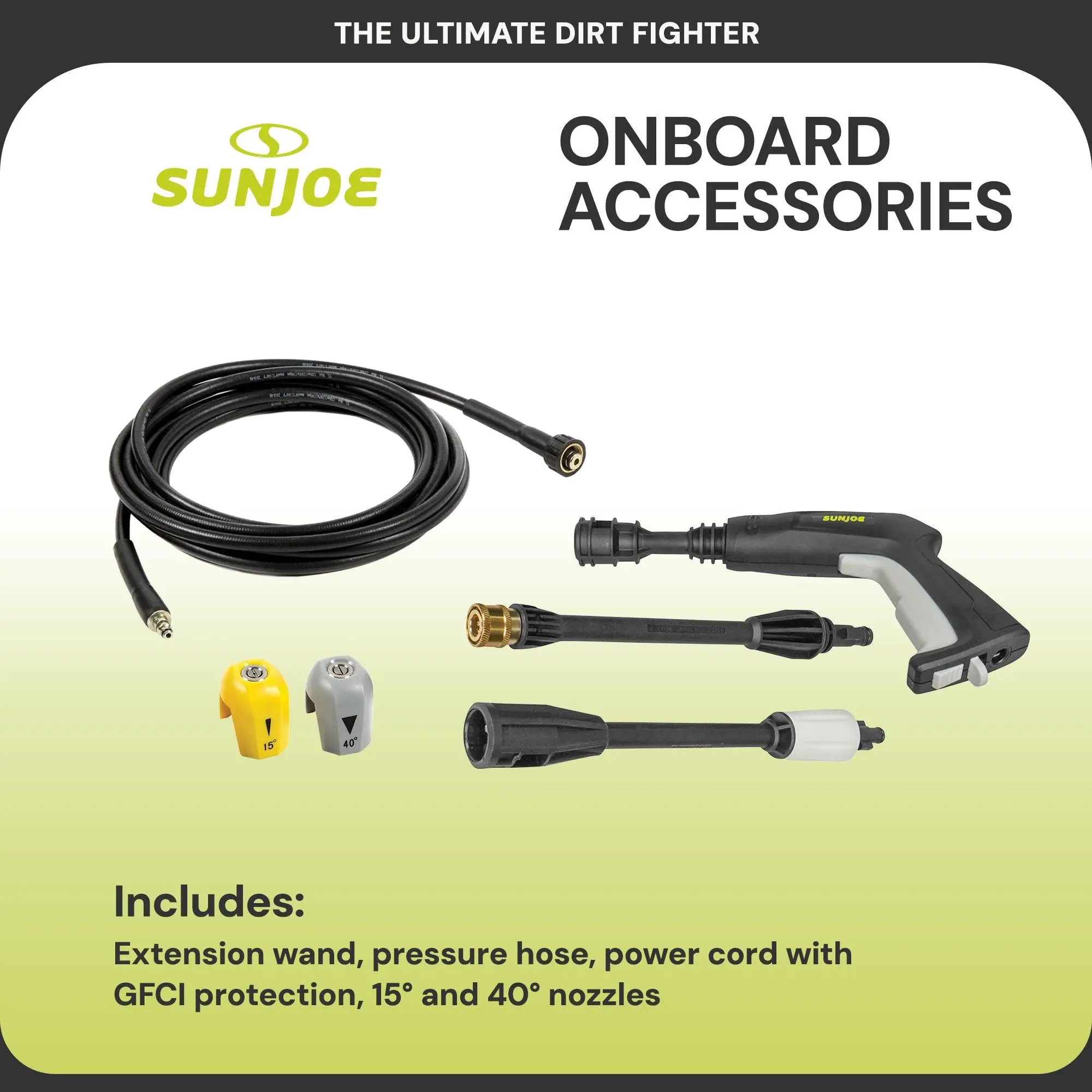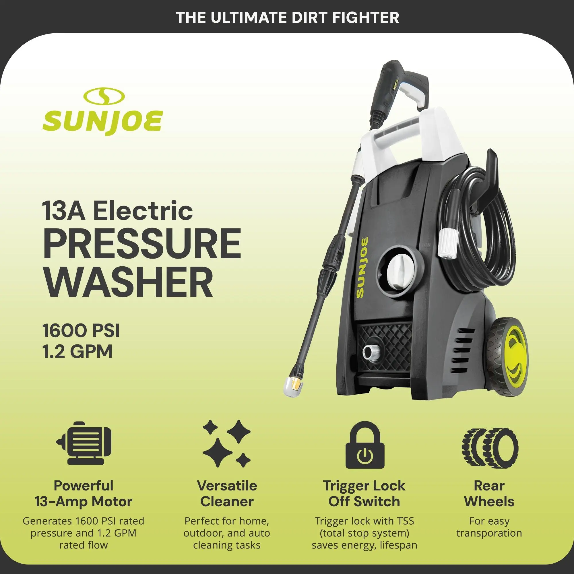 Tackle your outdoor cleaning projects with confidence using the Sun Joe Portable Electric Pressure Washer, designed for powerful, efficient, and eco-friendly performance. Ideal for patios, decks, driveways, siding, fences, outdoor furniture, and vehicles, this lightweight yet durable unit delivers the cleaning strength you need without the hassle, noise, or emissions of gas-powered machines.Powered by a robust 11.5-amp motor, the pressure washer generates up to 1450 PSI of maximum pressure and 1.45 GPM of water flow, helping you blast away built-up dirt, grime, grease, and mildew from virtually any surface. The adjustable spray wand with twist nozzle lets you easily fine-tune the water pressure; switch from a wide, gentle spray for delicate surfaces to a focused jet stream for tough stains and heavy-duty cleaning.For added efficiency and longevity, Sun Joe’s Total Stop System (TSS) automatically shuts off the pump when the trigger is not engaged, saving energy and extending the life of the motor and pump components. The pressure washer also includes a 20-foot high-pressure hose, 35-foot power cord with GFCI protection, extension wand, and garden hose adapter, providing the reach and flexibility needed to tackle jobs near and far from your water source.Weighing just 11.7 pounds, the Portable Electric Pressure Washer from Sun Joe is easy to lift, carry, and store, making it a perfect choice for homeowners seeking convenience and versatility in a compact design. Built for dependable performance and everyday use, this electric pressure washer delivers the ideal balance of portability, power, and precision cleaning.