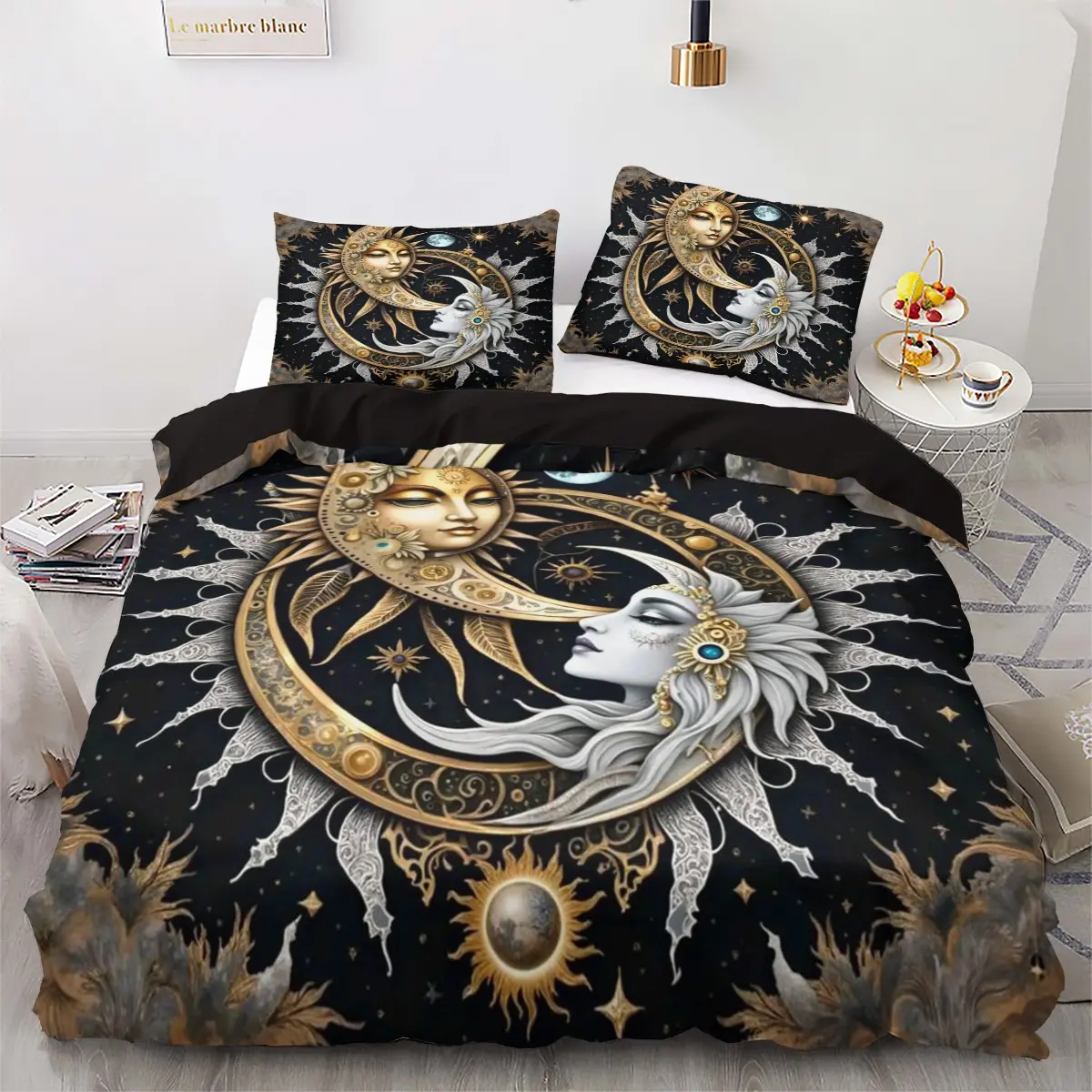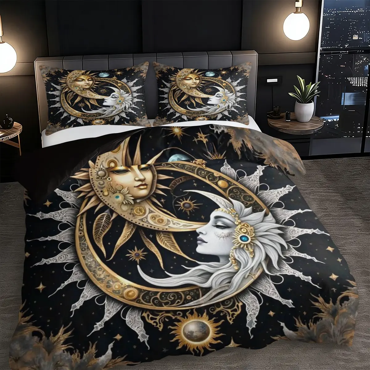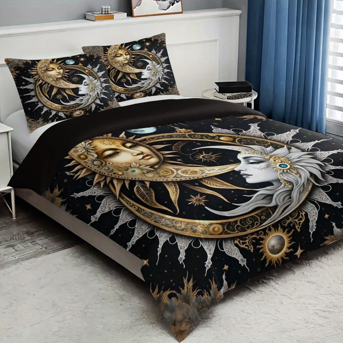 【Celestial Theme】: Featuring a distinctive sun and moon goddess mythology graphic to enhance your bedroom's ambiance.